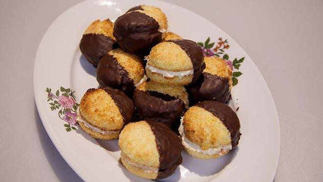 Kokosmakronen zijn altijd een traktatie voor bij de thee of koffie. Deze gevulde kokosmakronen met chocolade van Rudolph van Veen zijn net even iets specialer. Jum!
