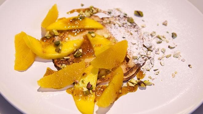 Leg de pannenkoek op een (warm) bord. Verdeel er de sinaasappelpartjes en mango over. Verwarm de saus en lepel over het fruit. Strooi de pistache erover en bestuif een kan van het bord met poedersuiker.