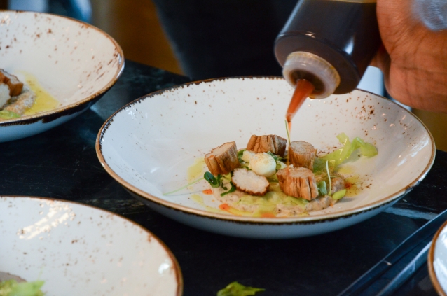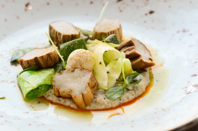 Koningsboleet met olijfolie, schorsenerencrème en kwarteleitjes