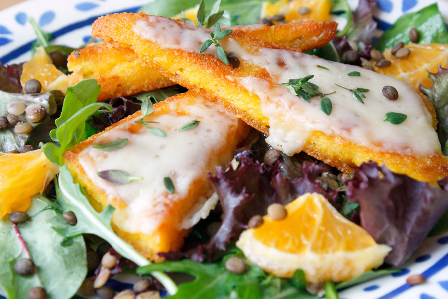 Krokante polenta met Italiaanse provolone-kaas en tijm
