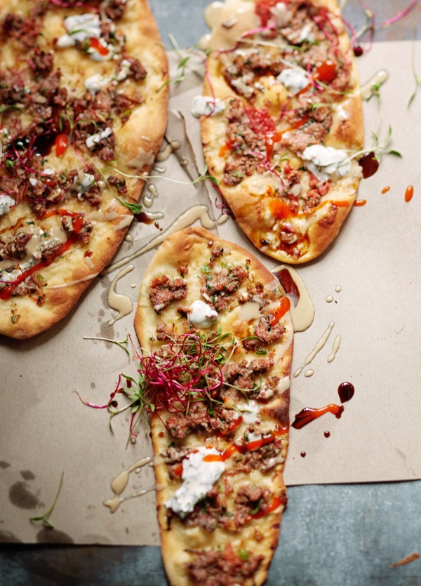Verdeel het gehaktmengsel gelijk over de bodems en bak ze af in een op 200 graden voorverwarmde oven. Je kunt de pizza’s afbakken op een pizzasteen, maar het werkt ook prima op een ingevet bakblik. Het bakken duurt een minuut of 10. Serveer met naar smaak wat citroensap, tahin en granaatappelmelasse.