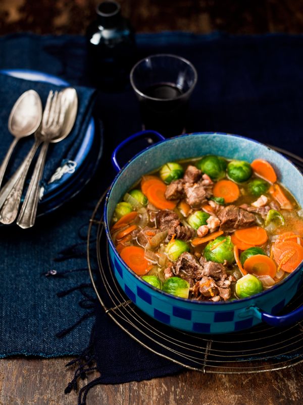 Voeg het sap toe en breng het gerecht tegen de kook. Laat het vlees op heel laag vuur in ± 3 uur gaar worden*. Laat de spruitjes de laatste 30 minuten van de stooftijd mee garen in de pan.