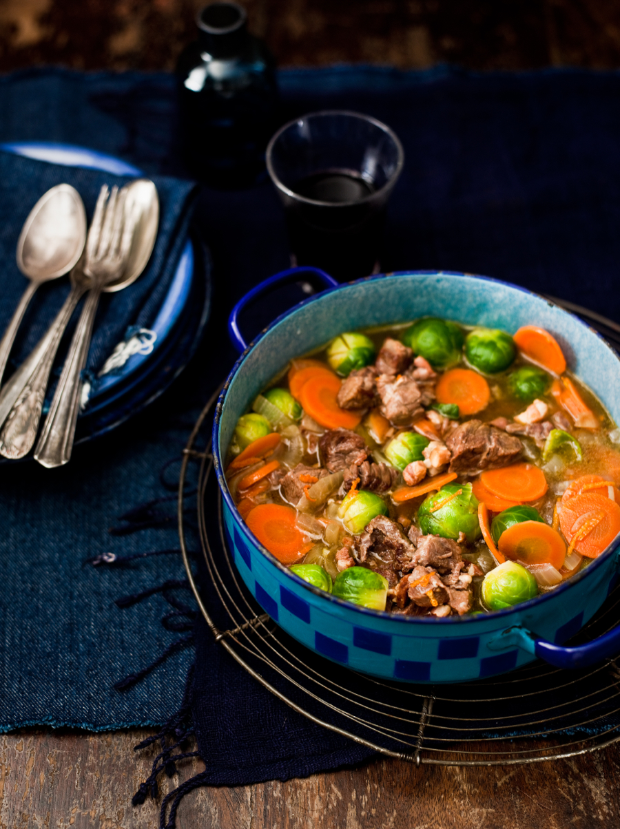 Snij het vlees in blokjes. Wentel de vleesblokjes in een kom door de bloem en bestrooi ze met peper en zout. Verhit de helft van de boter in een grote braadpan en bak het vlees in ± 5 minuten rondom bruin. Schep het vlees uit de pan en smelt de rest van de boter. Voeg de spekblokjes toe en bak ze een paar minuten. Snipper de ui en snij de winterpeen in schijfjes.