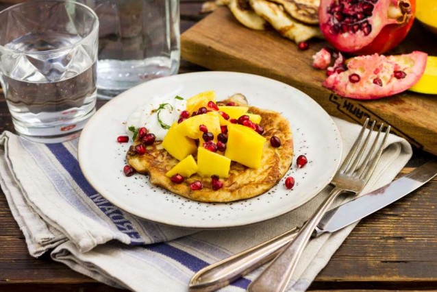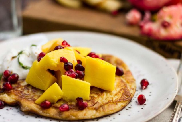 Op zoek naar een snel en lekker toetje? Maak dezeĀ kwarkpannenkoekjes met mango en granaatappel.