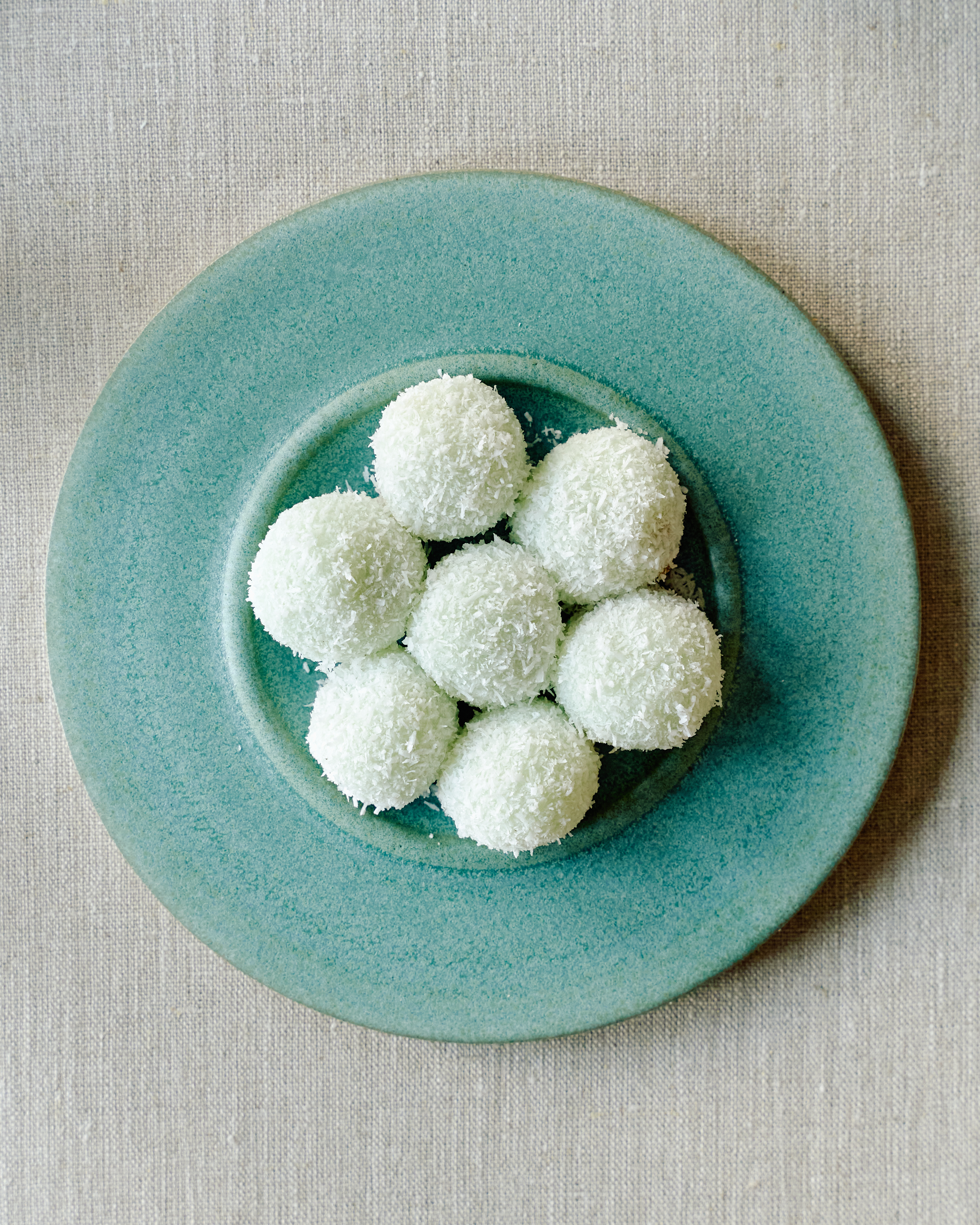 Kwee Klepon (zoete balletjes met palmsuiker, kokos en pandan)