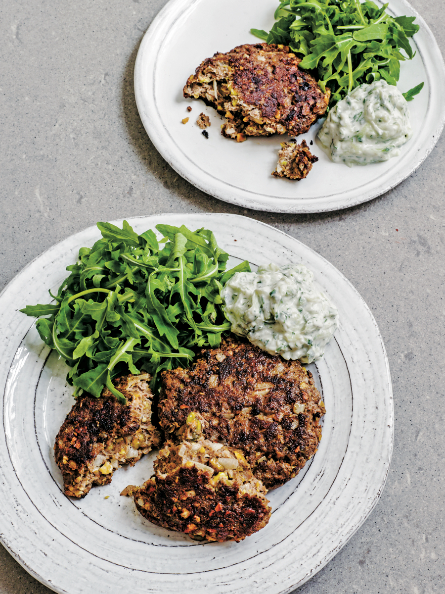 “Dit is mijn snelle, eenvoudige versie van de Turkse fistikli kebap. Ik heb een paar ingrediënten toegevoegd die goed bij pistachenoten passen. Bij gebrek aan een barbecue maak ik graag hamburgers van het mengsel, die je eenvoudig in een koekenpan kunt bakken. Je kunt er ook gehaktballetjes, grotere hamburgers of langwerpige spiesjes van maken. Serveer dit gerecht met cacik (yoghurt met wat komkommer, knoflook & dille) of Griekse yoghurt.”