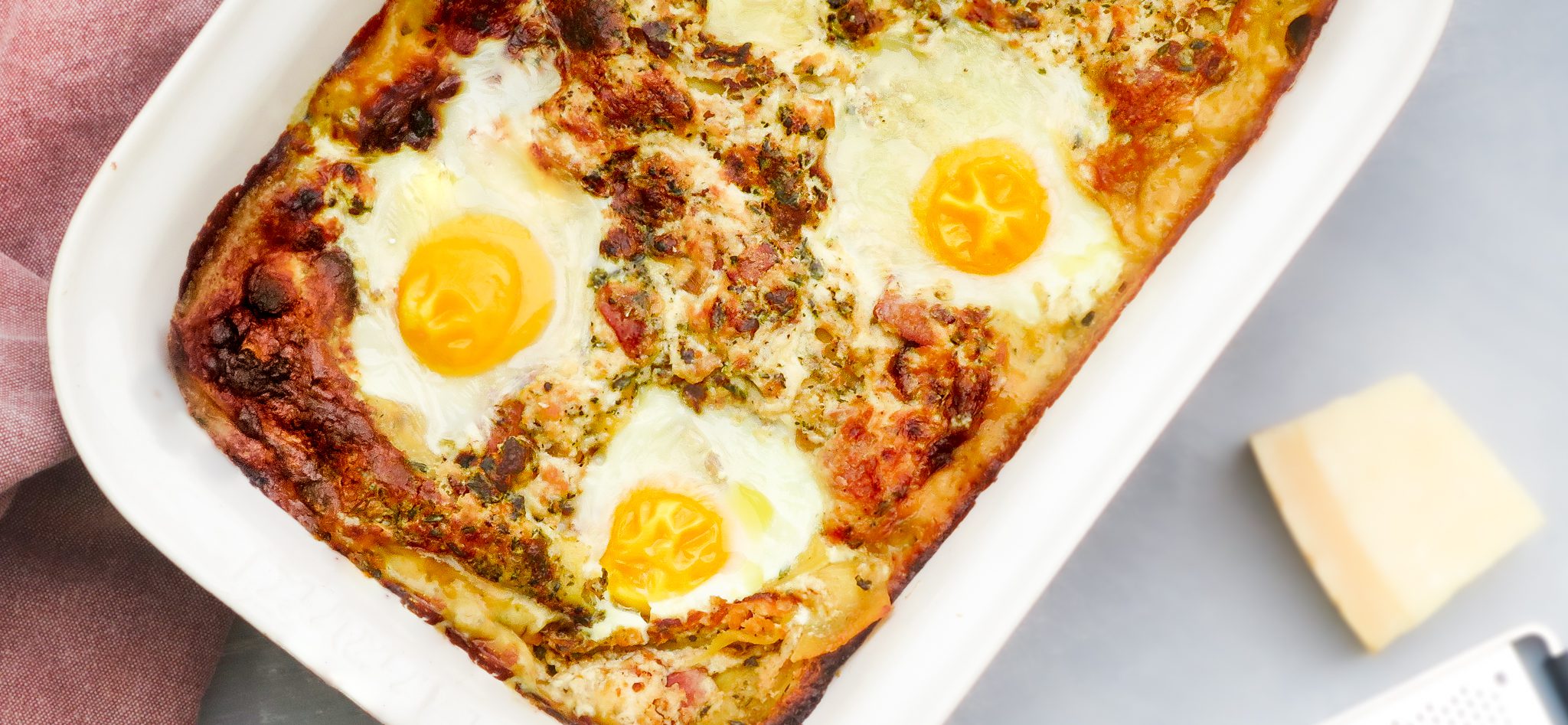 Dol op lasagne, maar ben je het klassieke recept een beetje beu? Maak dan eens lasagne carbonara, da’s lasagne met spek, pancetta & Parmezaan