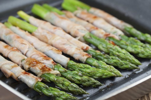 Een simpel en snel, maar heerlijk hapje: gegrilde groene asperges omwikkeld met gedroogde of gekookte ham. Lekker voor tijdens de borrel of als bijgerecht tijdens een diner.