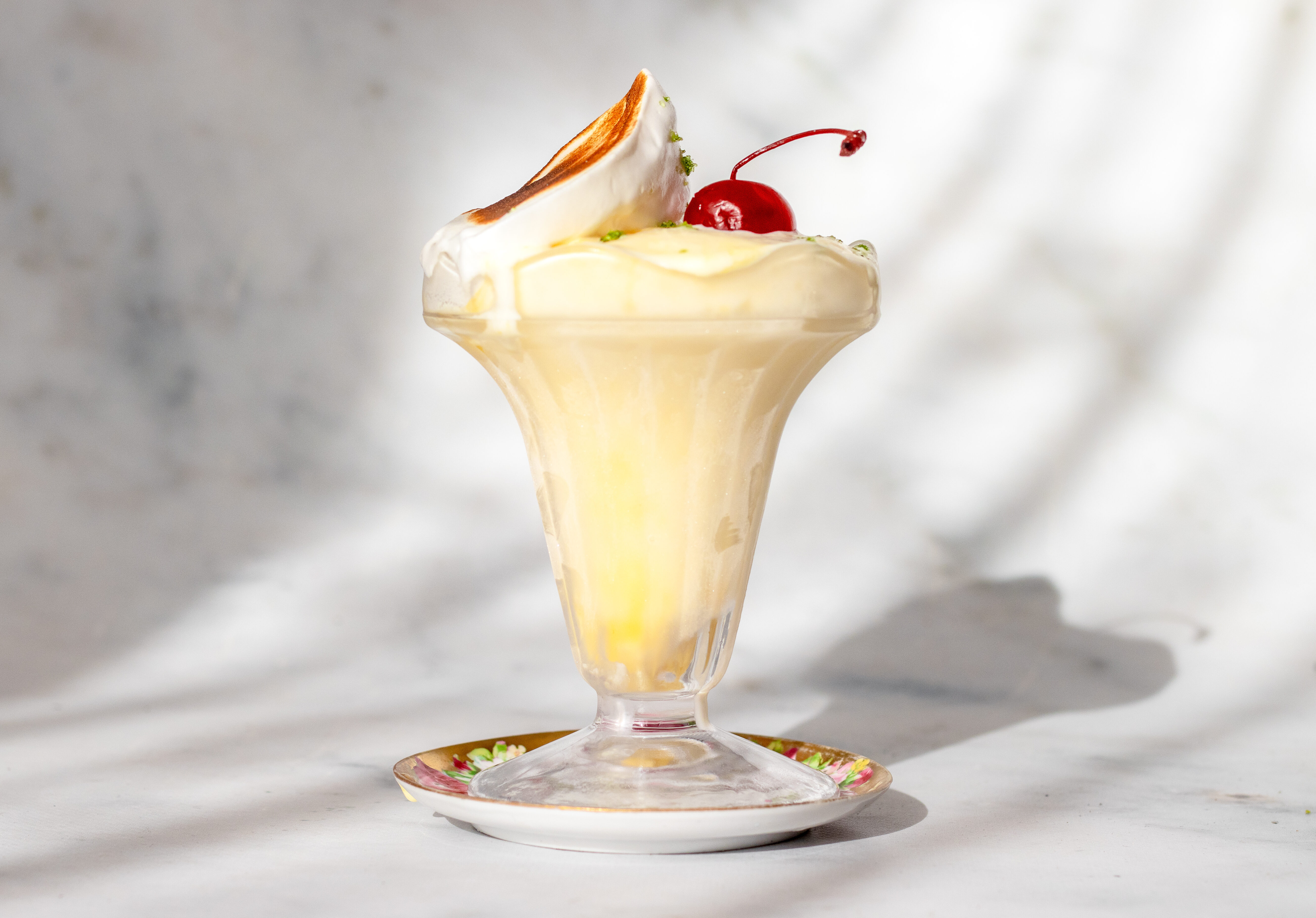 - Schep bolletjes lemon curd ijs in schaaltjes of coupes. Schep de meringue op het ijs en karamelliseer met de gasbrander. Bestrooi vervolgens met basilicumsuiker en maak af met een cocktailkersje.