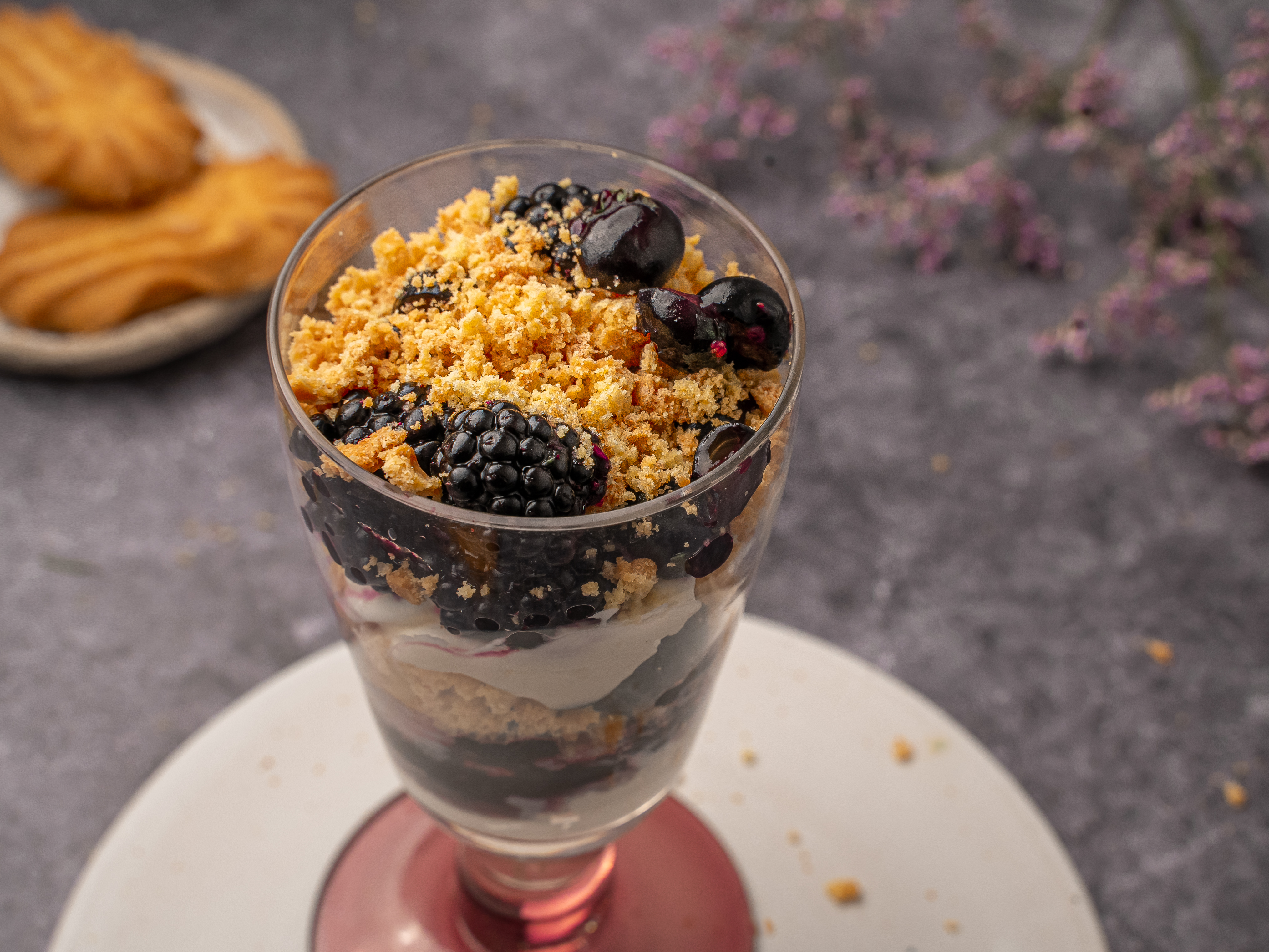 - Vul glazen met een laag mascarpone, gevolgd door een laag van het bessen-vlierbloesemmengsel en daarna een laag koekkruimels. Herhaal dit ongeveer twee keer, afhankelijk van de grootte van je glazen.