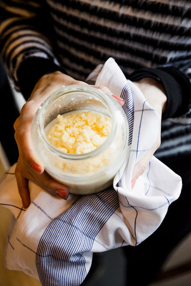 Leg nu de boter terug op de gebruikte doek en knijp het laatste vocht eruit. Hierdoor blijft de boter langer houdbaar (ongeveer drie weken) en wordt de smaak alleen maar beter.