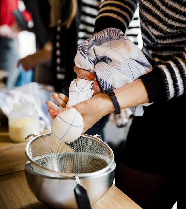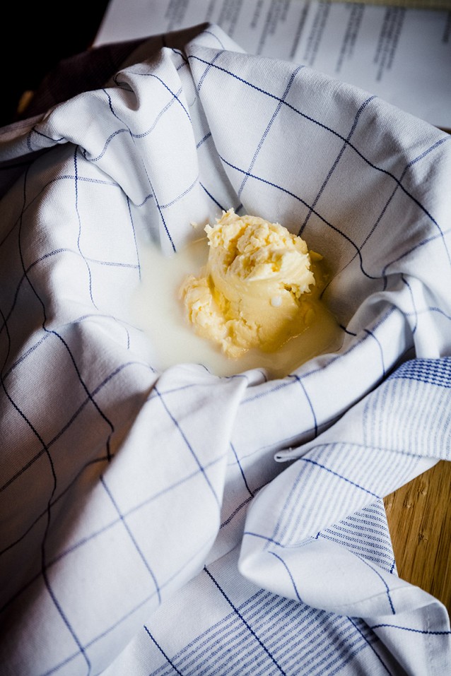 Giet de wrongel en karnemelk door de met een kaas- of theedoek bedekte zeef. Verzamel de punten van de doek en druk de inhoud tot een bal. Draai en knijp voorzichtig zodat je zoveel mogelijk karnemelk uit de boter drukt.