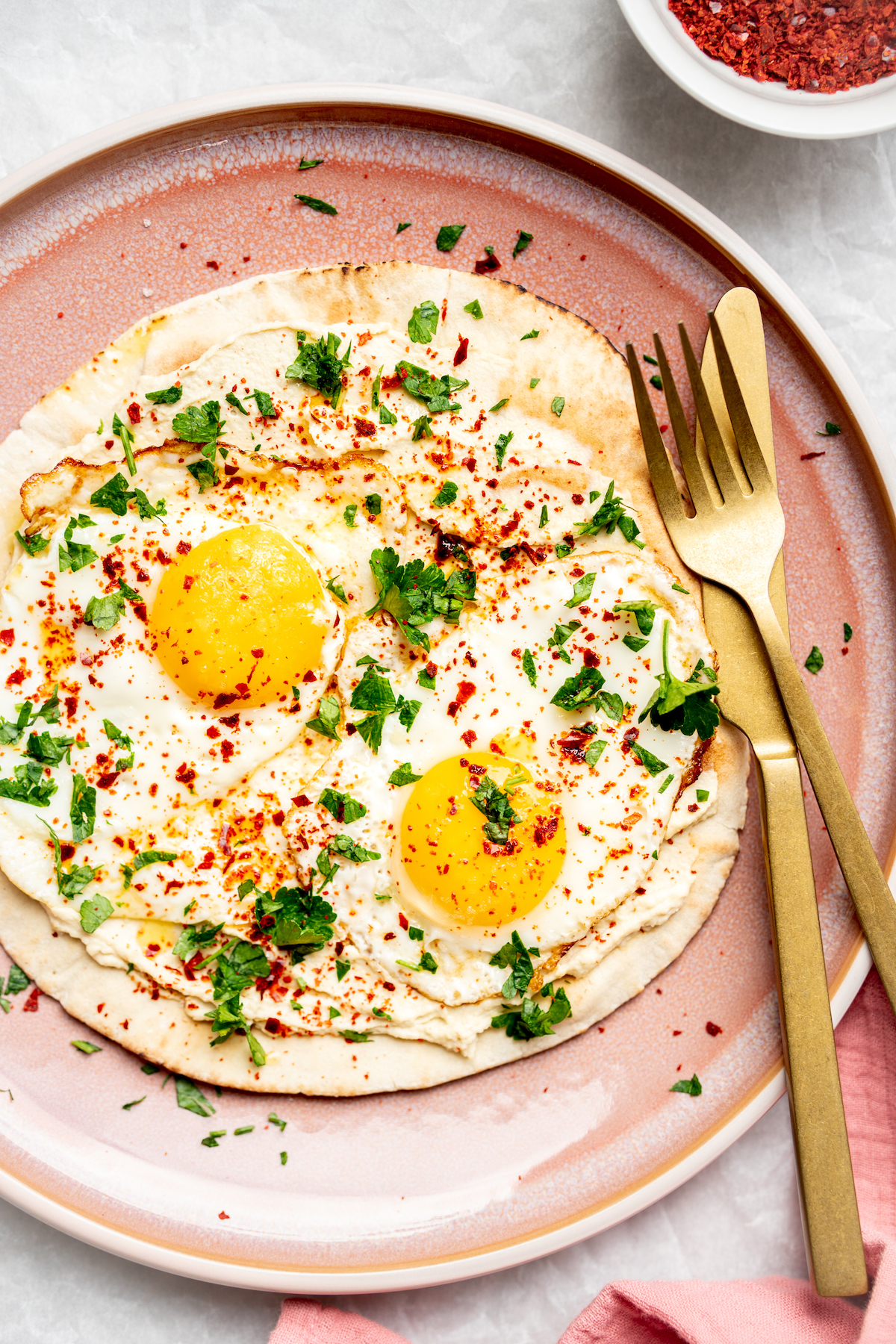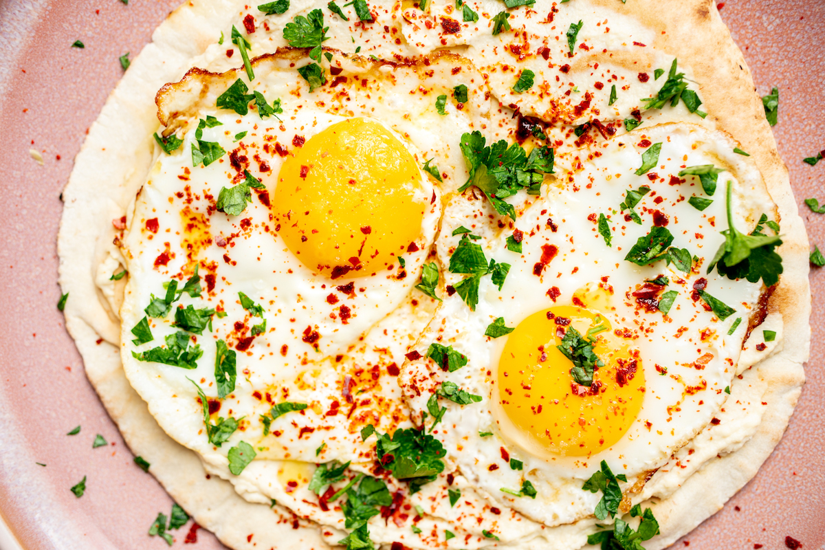 Een broodje met gebakken ei is een klassieker, maar je kunt ām ook een Midden-Oosterse twist geven! Serveer de eieren op Libanees brood met hummus en flink veel pul biber (ook wel bekend als aleppo-peper) eroverheen. Een superlekker en makkelijk lunchgerecht waar je blij van wordt.