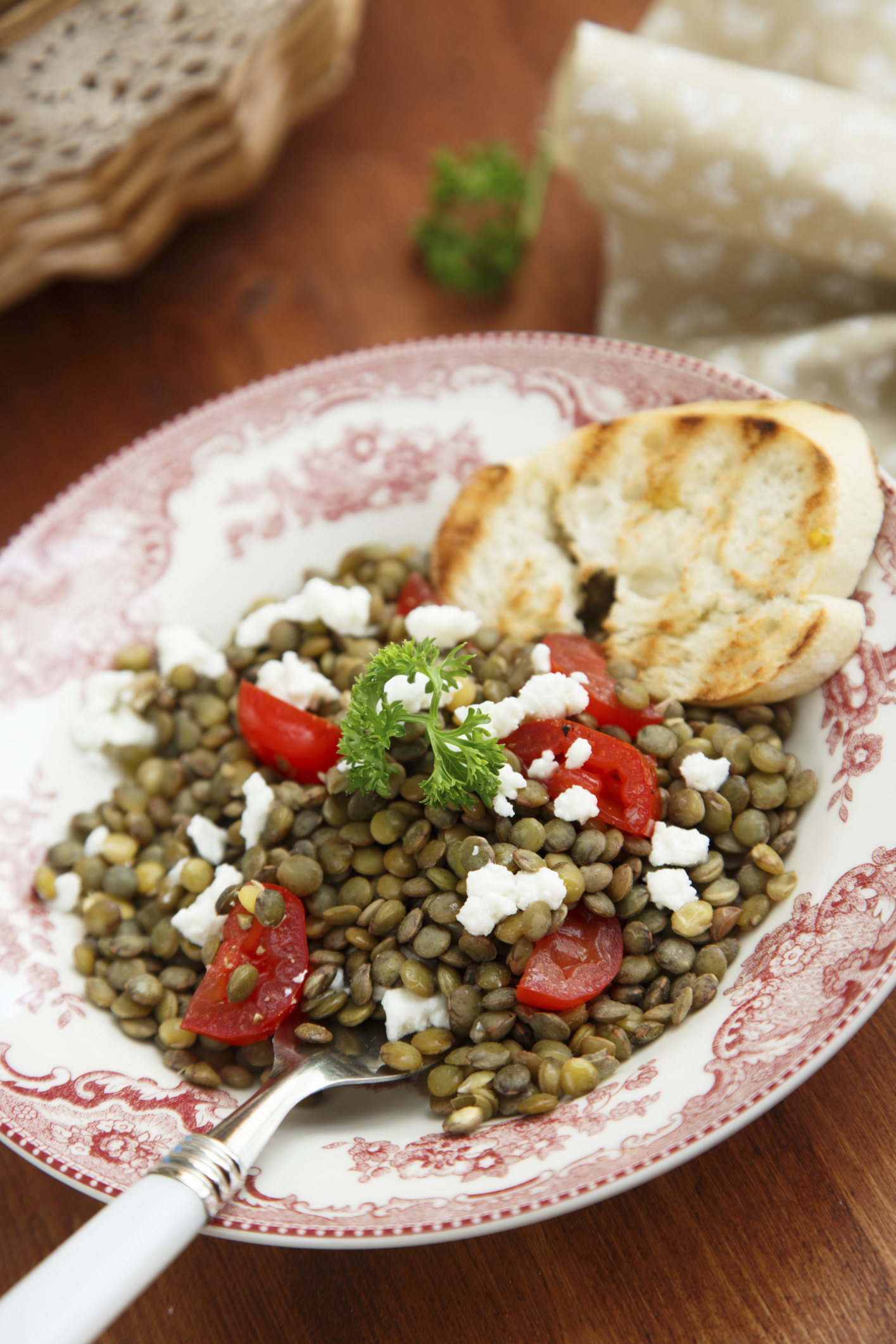 Deze linzensalade met feta en tomaatjes is heerlijk én gezond.