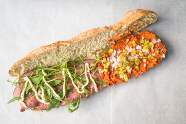 Beleg bijvoorbeeld één helft met rosbief, rucola, truffelmayonaise en eventueel Parmezaanse kaas. Op de andere helft gaat filet américain met uitjes en augurkjes.