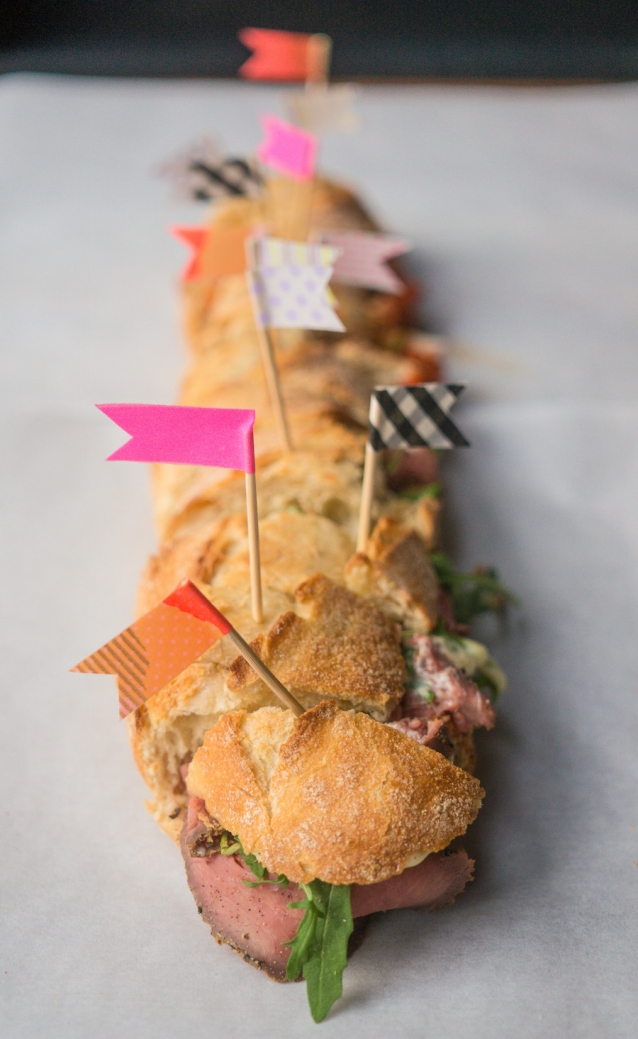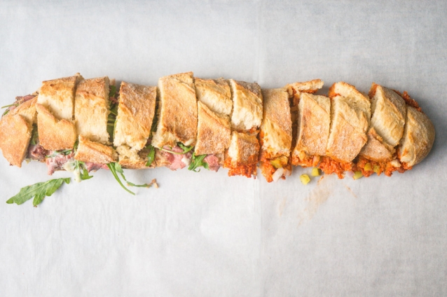 Deze truc zagen we op Food52: met één belegd stokbrood kun je heel snel 12 hapjes maken (of meer, als je een groter stokbrood vindt). Ideaal voor een potluck, picknick of feestje.