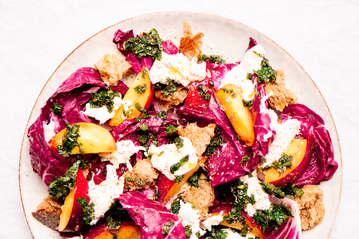 Deze maaltijdsalade met nectarines en Burrata is zó klaar en bovendien alles waar je naar verlangt op een warme, zomerse dag. Lekker met radicchio en een simpele dressing met munt en jalapeño.