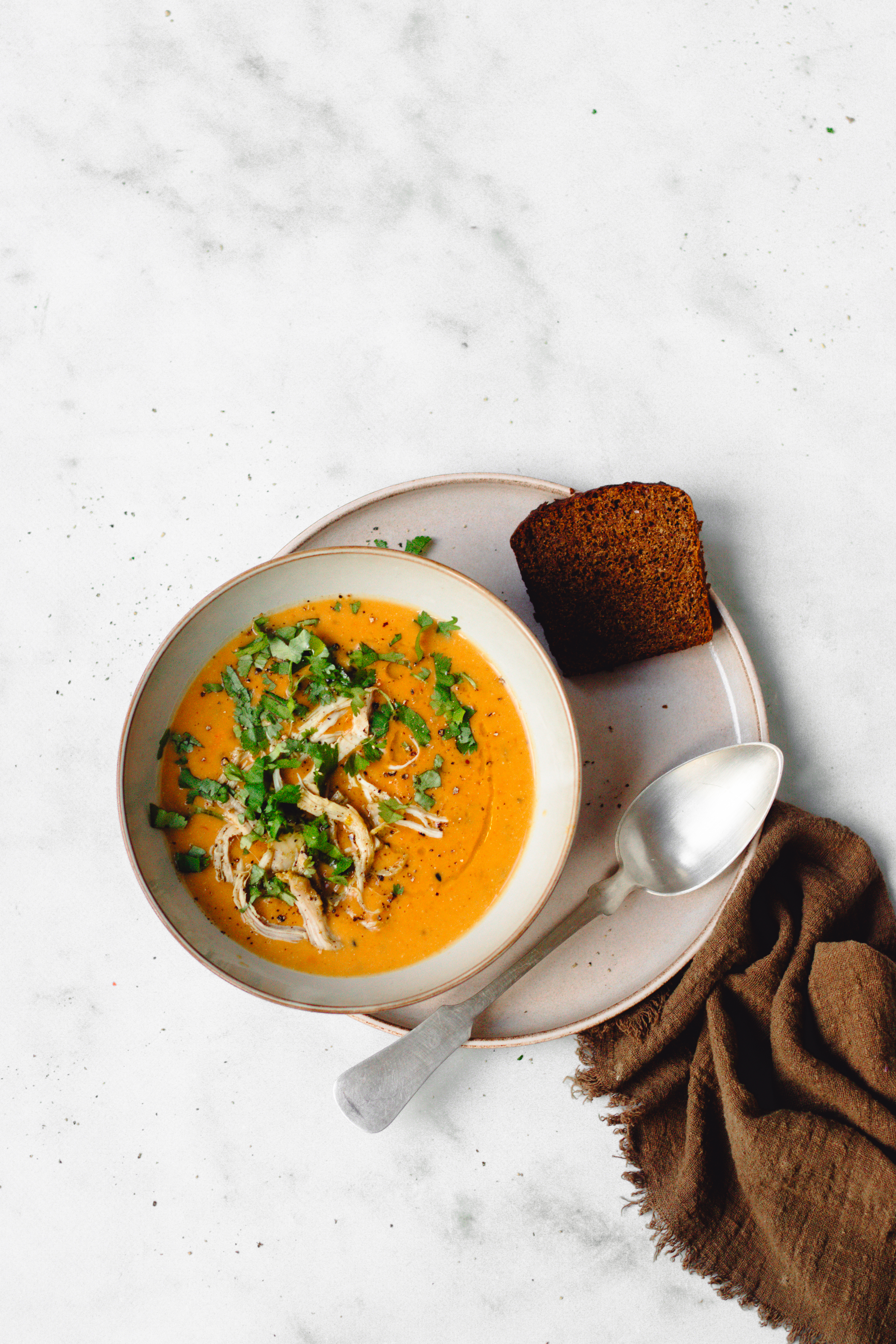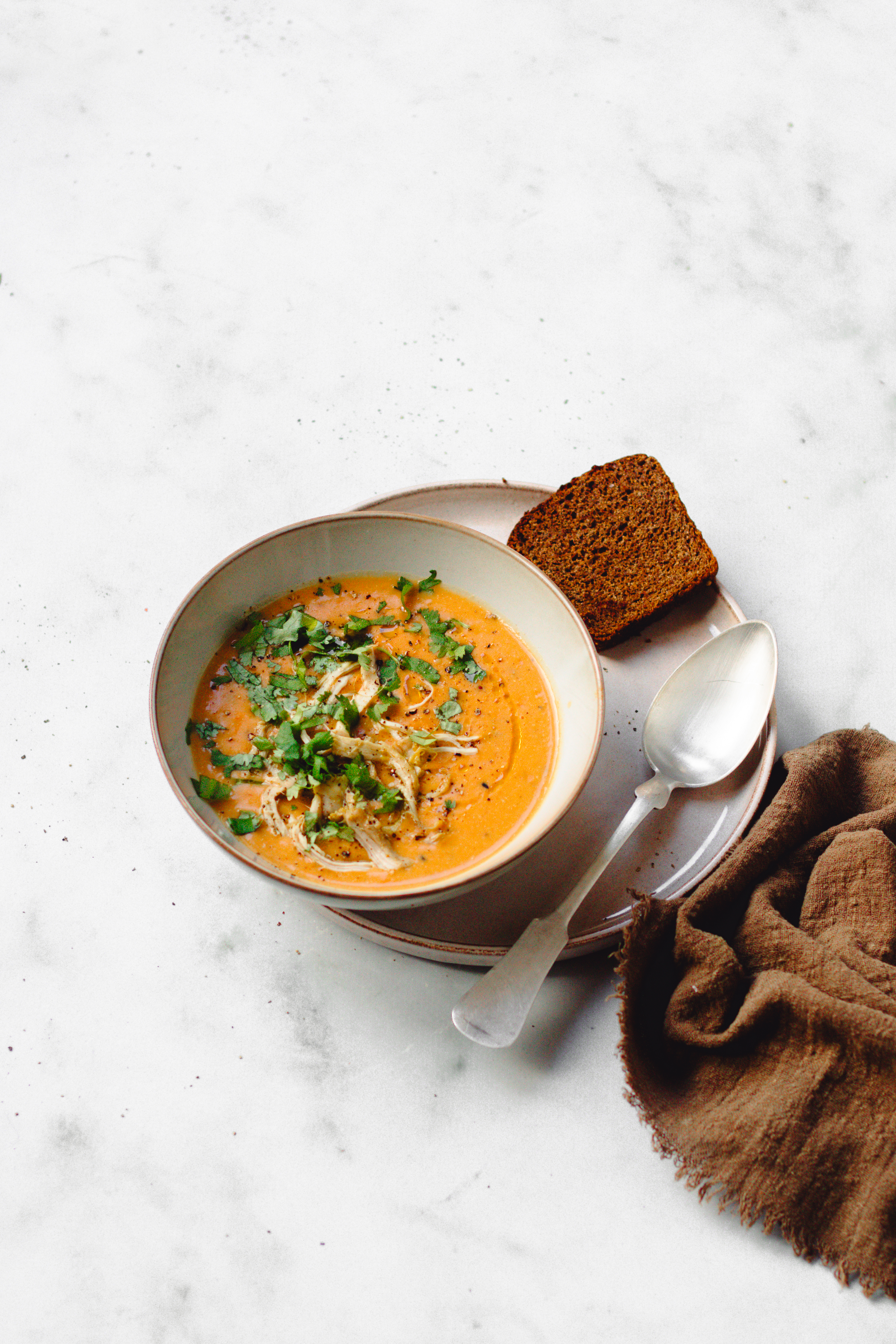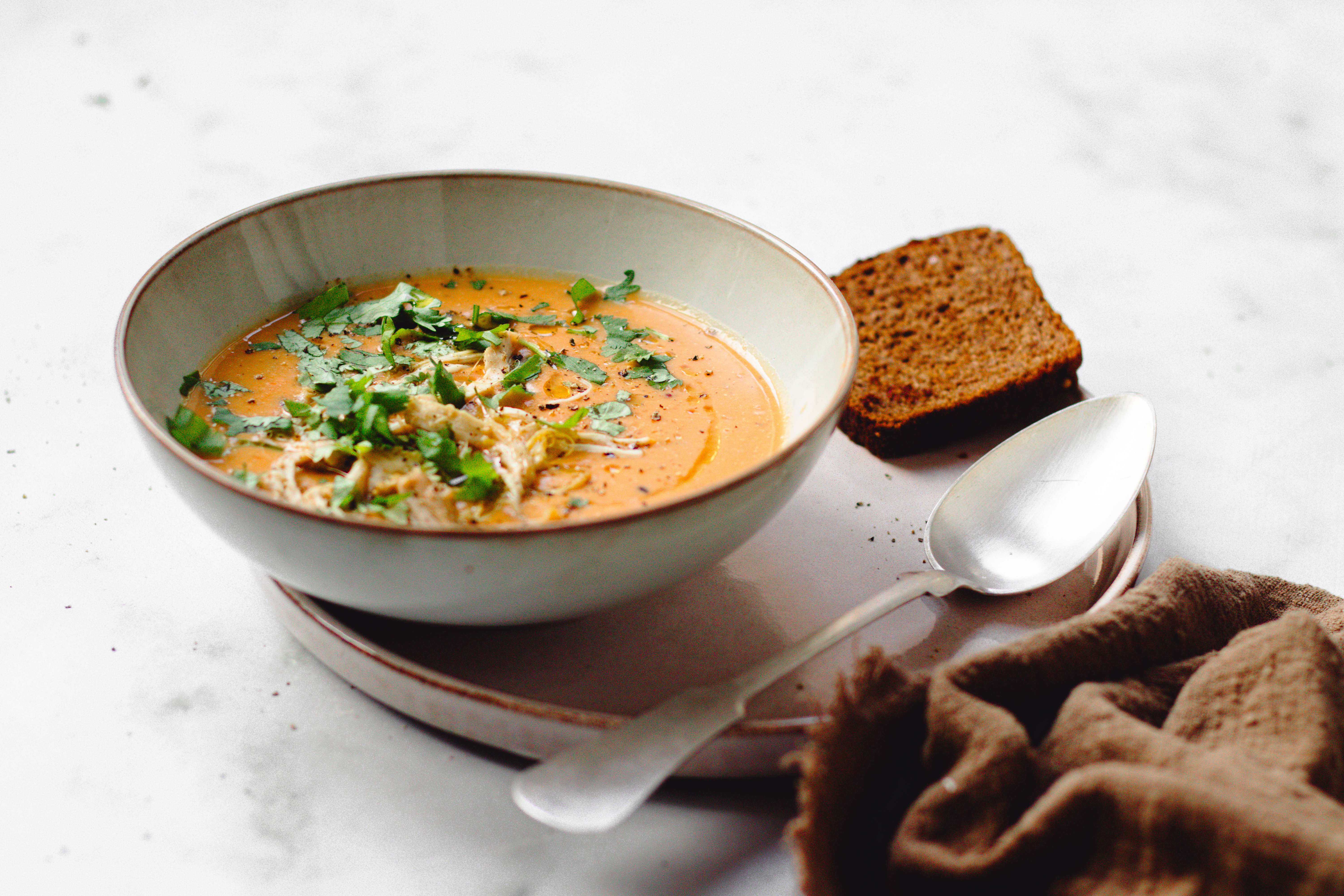 - Verdeel de maaltijdsoep over de kommen met de stukjes kip en maak af met een scheut kokosmelk per kom en verse koriander.