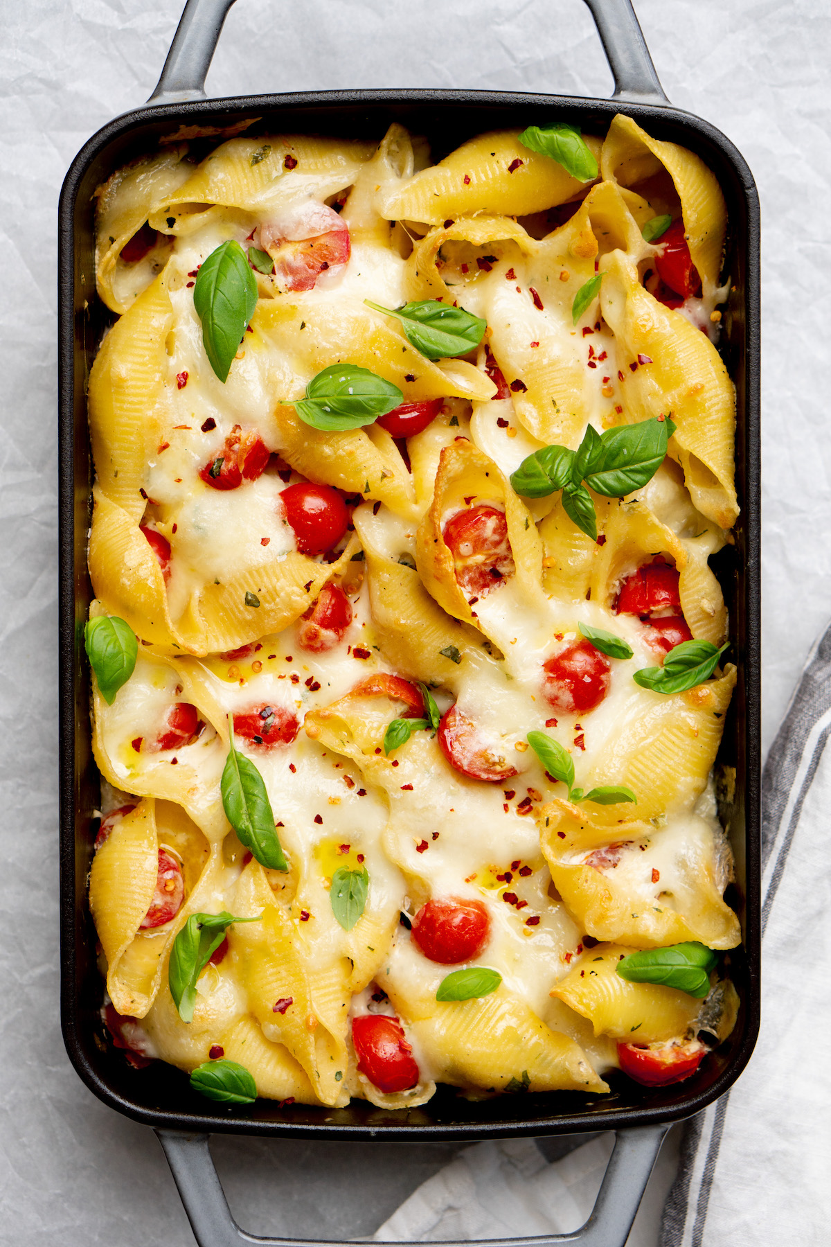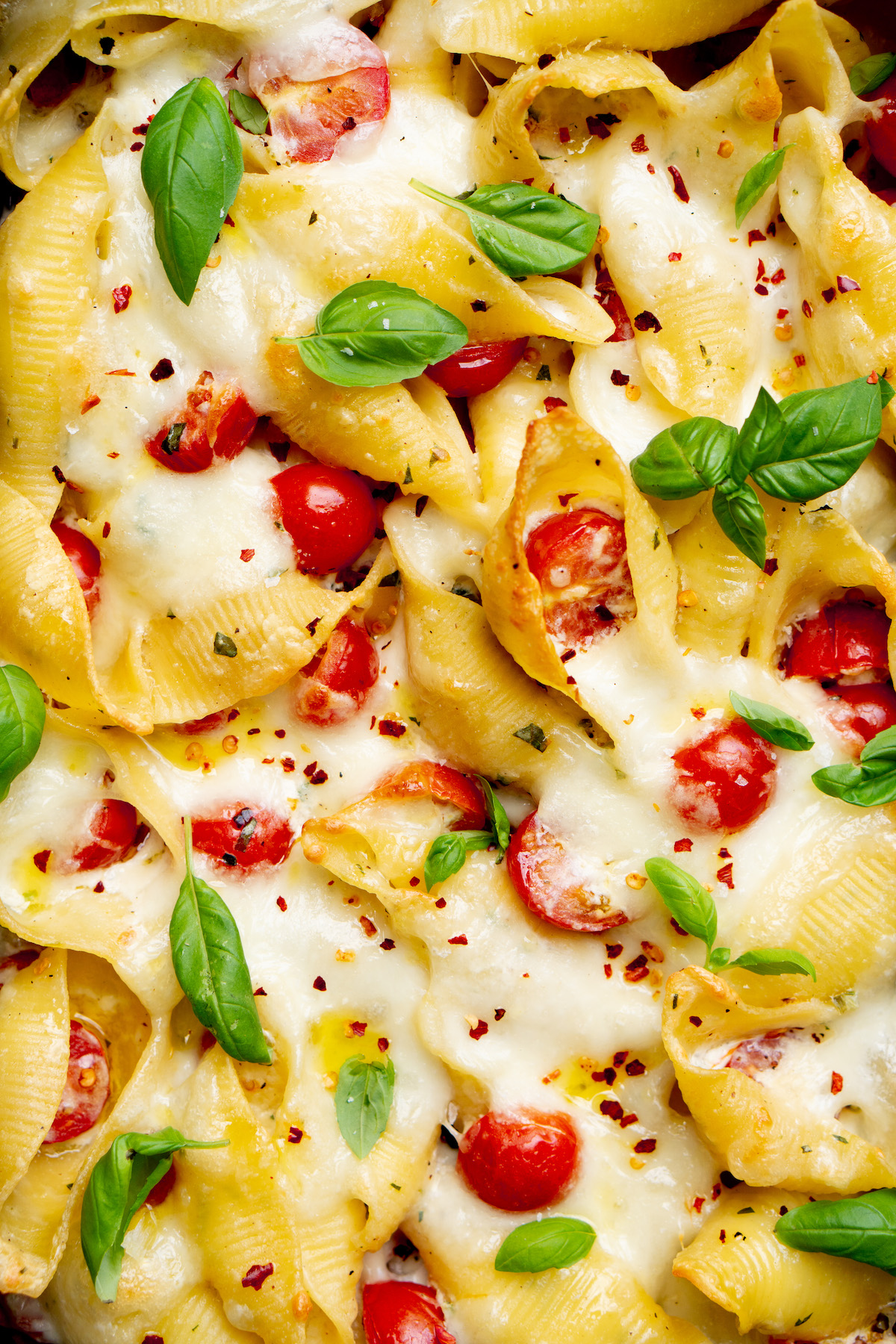 - Bak de pastaschotel in ongeveer 20 minuten goudbruin. Sprenkel er voor het opdienen nog wat olijfolie, gedroogde chili en zout en peper overheen. Maak af met wat achtergehouden blaadjes basilicum.