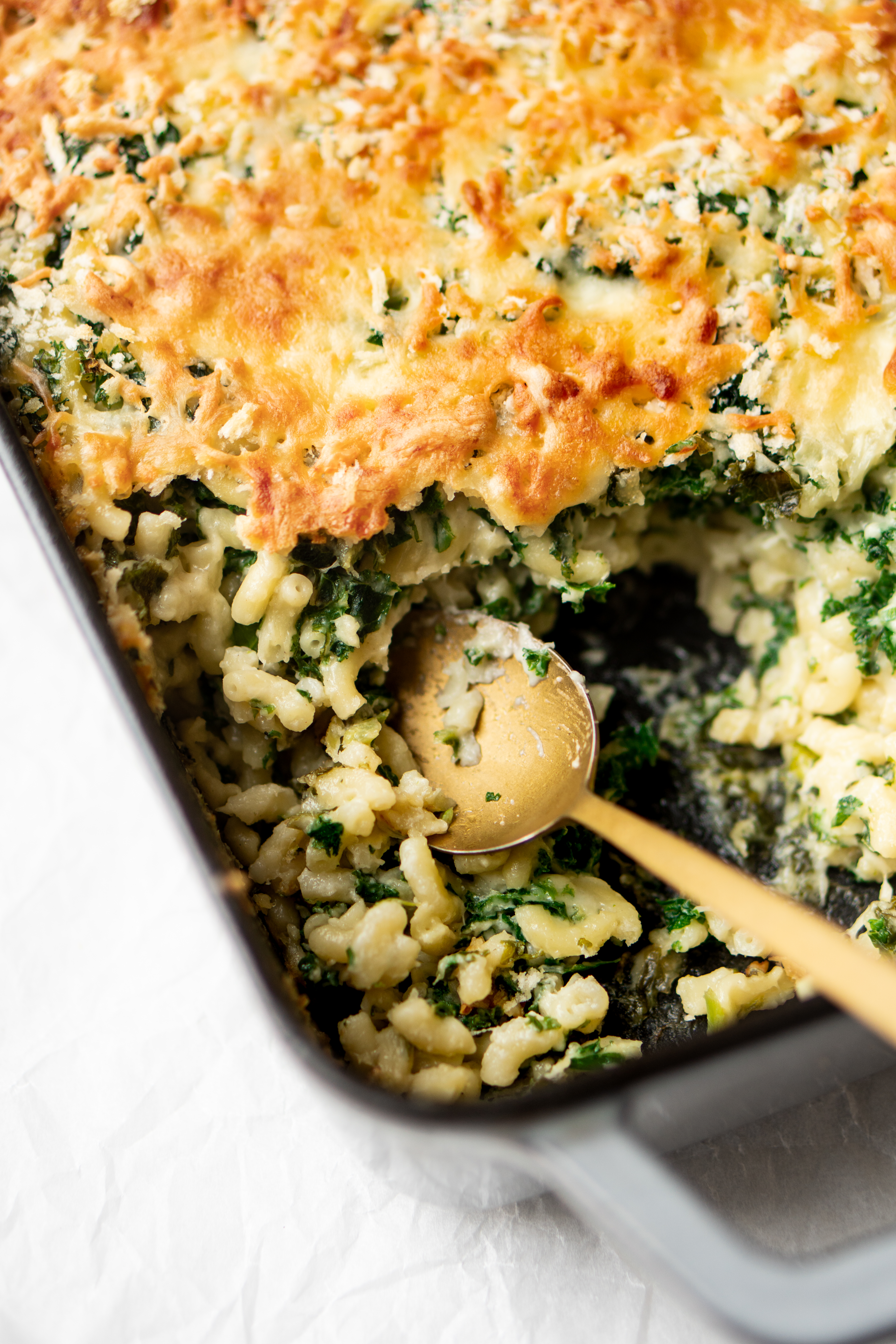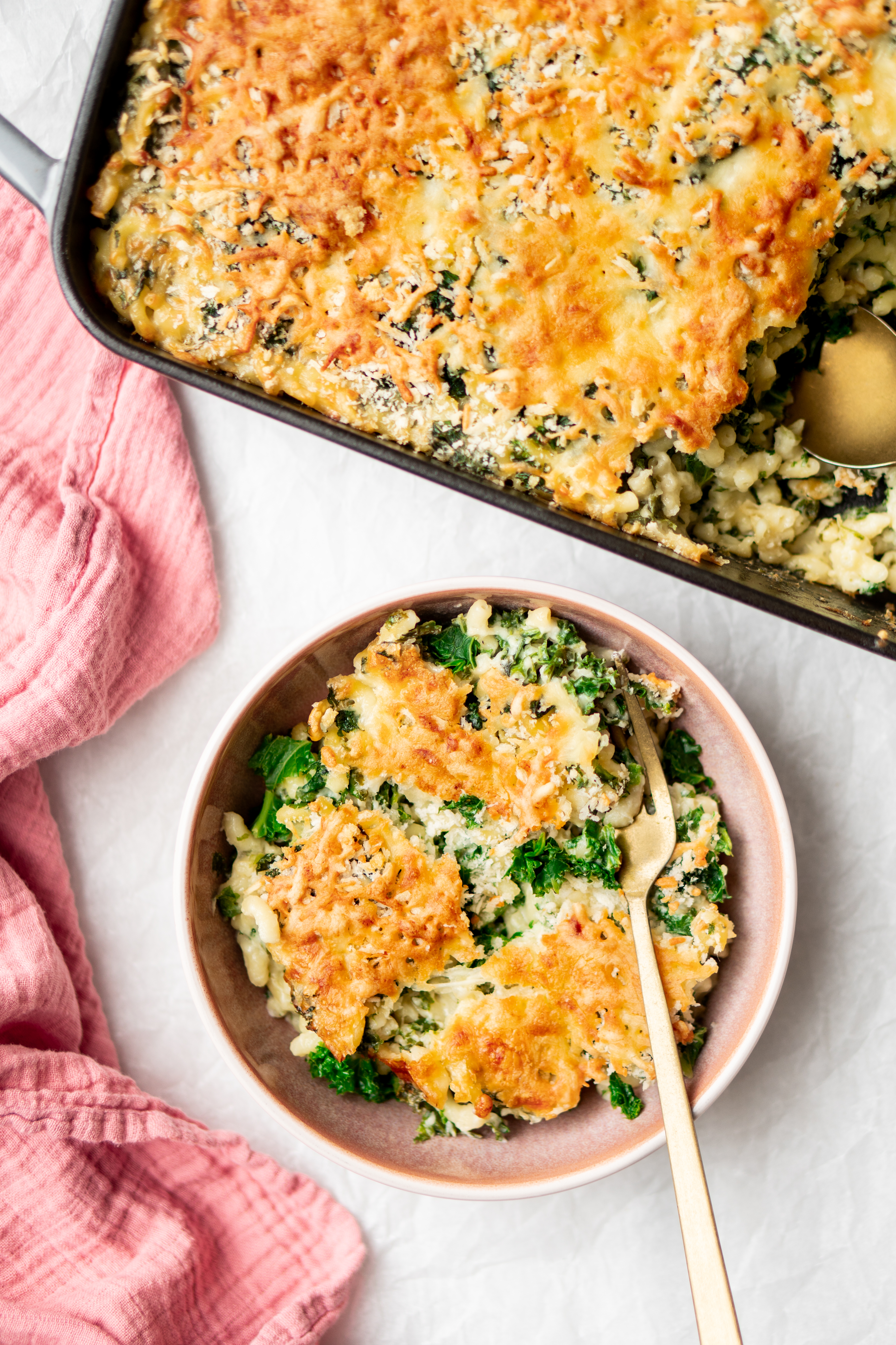 Een iets gezondere mac ān cheese dan de normale editie: met lekker veel boerenkool. Niet alleen krijg je zo extra vezels en vitaminen binnen, boerenkool geeft ook een volwassenere smaak aan deze jeugdfavoriet, met een klein bittertje.