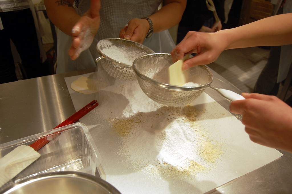 Zeef het amandelmeel én de poedersuiker door een superfijne zeef en meng de twee gezeefde poeders door elkaar. Hoe fijner, hoe beter! Meng het eiwit (niet het eiwit dat je straks stijfklopt, maar het gewone eiwit uit het eerste ingrediëntenlijstje) hier doorheen (bijvoorbeeld met een siliconen spatel) tot er een mooie, egale structuur ontstaat. Hier moet je wat handigheid in krijgen.