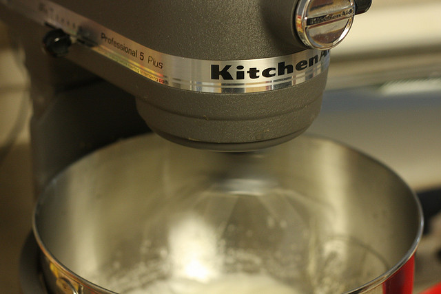 Doe ondertussen de eiwitten (er mag geen spoortje eigeel in zitten) in de kom van je mixer of keukenmachine (waar een garde-opzetstuk in zit), maar klop nog niet. Als het suikerwater 115 graden heeft bereikt, kun je beginnen met de eiwitten stijf te kloppen. Begin langzaam en voer dan de klopsnelheid op.