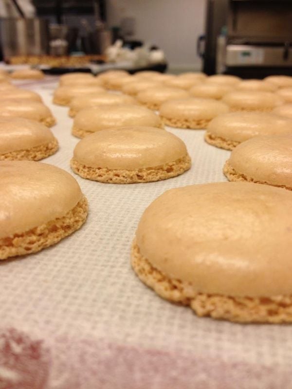De macaron mag van binnen niet meer vochtig/nat zijn. Breek er een open en beoordeel de vochtigheid. Laat ze op het bakblik afkoelen en haal de macarons er voorzichtig eraf. Bestuif de macarons licht met cacaopoeder.