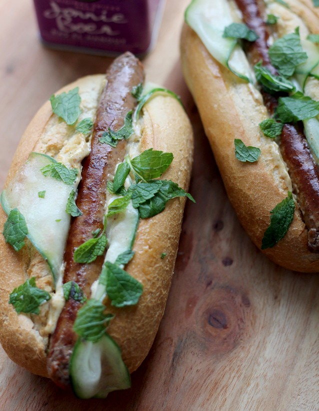 Snijd de broodjes verticaal aan de bovenkant open (maar niet helemaal door) en besmeer met de Ras el Hanout-mayonaise. Verdeel de komkommerlinten over de broodjes en leg vervolgens in elk broodje een worstje. Maak af met wat verse grofgehakte munt.