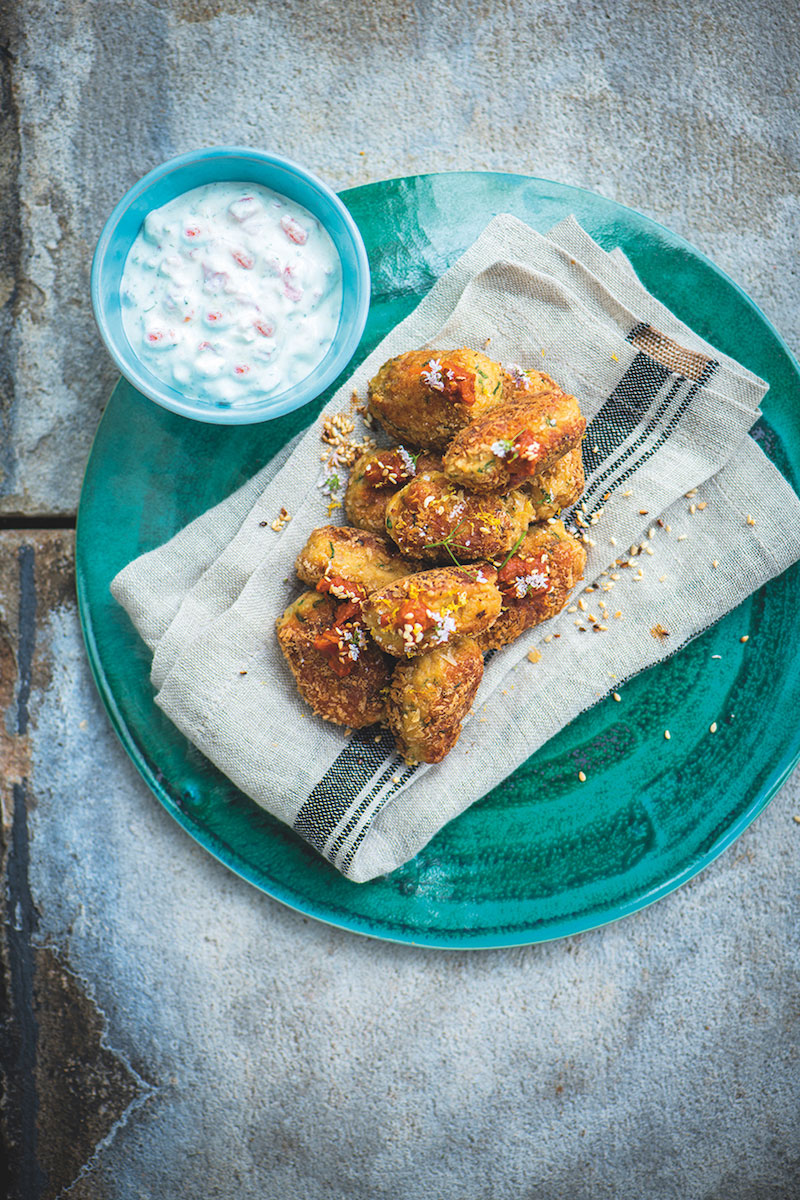 Bak de kipnuggets mooi rondom in de pan met olijfolie goudgeel tot ze gaar zijn en werk af met nog een beetje harissa, de geroosterde sesamzaadjes en wat citroenrasp.