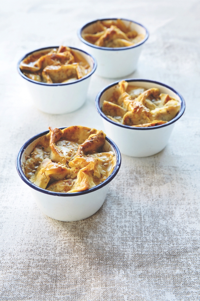 Snijd het deeg in vier cirkels die iets groter zijn dan de ovenschaaltjes. Leg op elk pasteitje een deegcirkel en duw het bij de randen naar binnen. Bestrijk het met wat boter en strooi er wat sesamzaad over. Bak de pasteitjes in 20 minuten goudbruin. Serveer de kip pasteitjes met gestoomde sperziebonen of een salade.