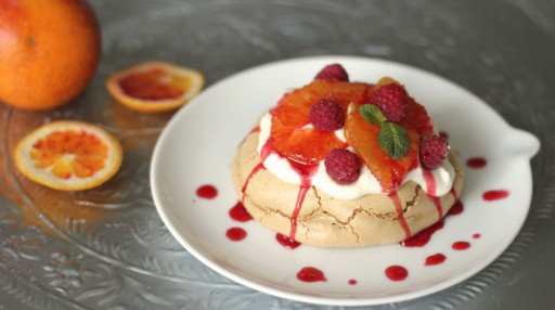 Leg op vier bordjes een meringue en verdeel de slagroom erover. Bekleed de slagroom met de partjes bloedsinaasappel en frambozen. Schenk er wat van de siroop over en garneer met kleine blaadjes munt.