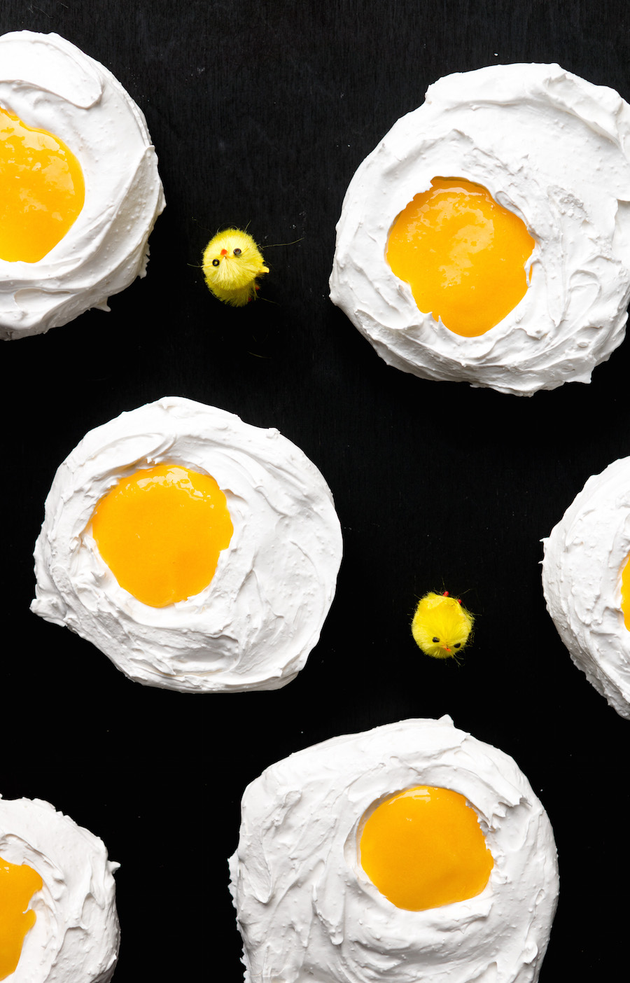 Dit zijn paaseitjes met een twist: deze meringue paaseitjes zien eruit als spiegeleitjes en hebben een ‘eidooier’ van mango-puree. Lekker om stukjes meringue in te dippen met Pasen!
