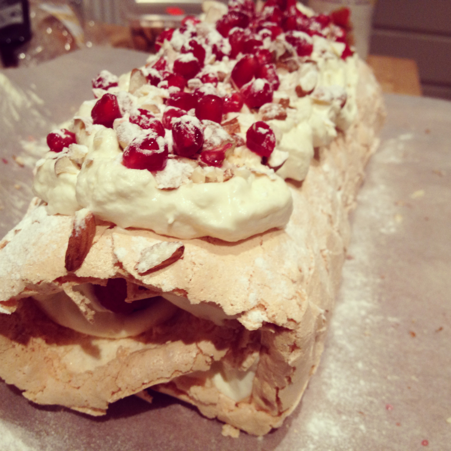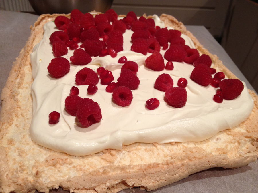 *Wij gebruikten frambozen, granaatappelpitjes en hazelnootjes, maar je kunt dit vervangen naar verschillende fruit- en nootsoorten naar keus. Let wel op dat het fruit niet te nat is, zoals bijvoorbeeld sinaasappel. Ook is het lekker om een paar eetlepels lemon curd door de room te mengen. Zo krijg je een heerlijk contrast tussen de zoete meringue en de vulling.