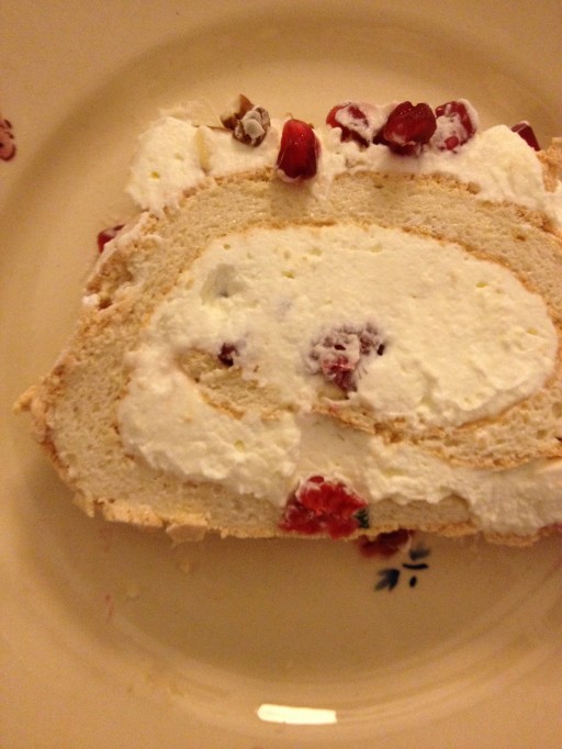 Bestrooi de rol voor het serveren met wat poedersuiker en strooi de rest van de granaatappelpitjes en amandelen over de room.