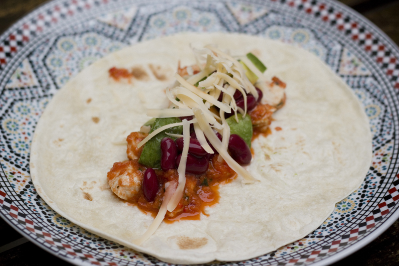Leg in het midden van een tortilla wat stukjes kip, de uitgelekte bonen en stukjes avocado. Top met een beetje geraspte kaas en rol de tortilla op. Doe dit met de rest van de wraps en ingrediënten en leg ze allemaal strak naast elkaar in de ovenschaal.