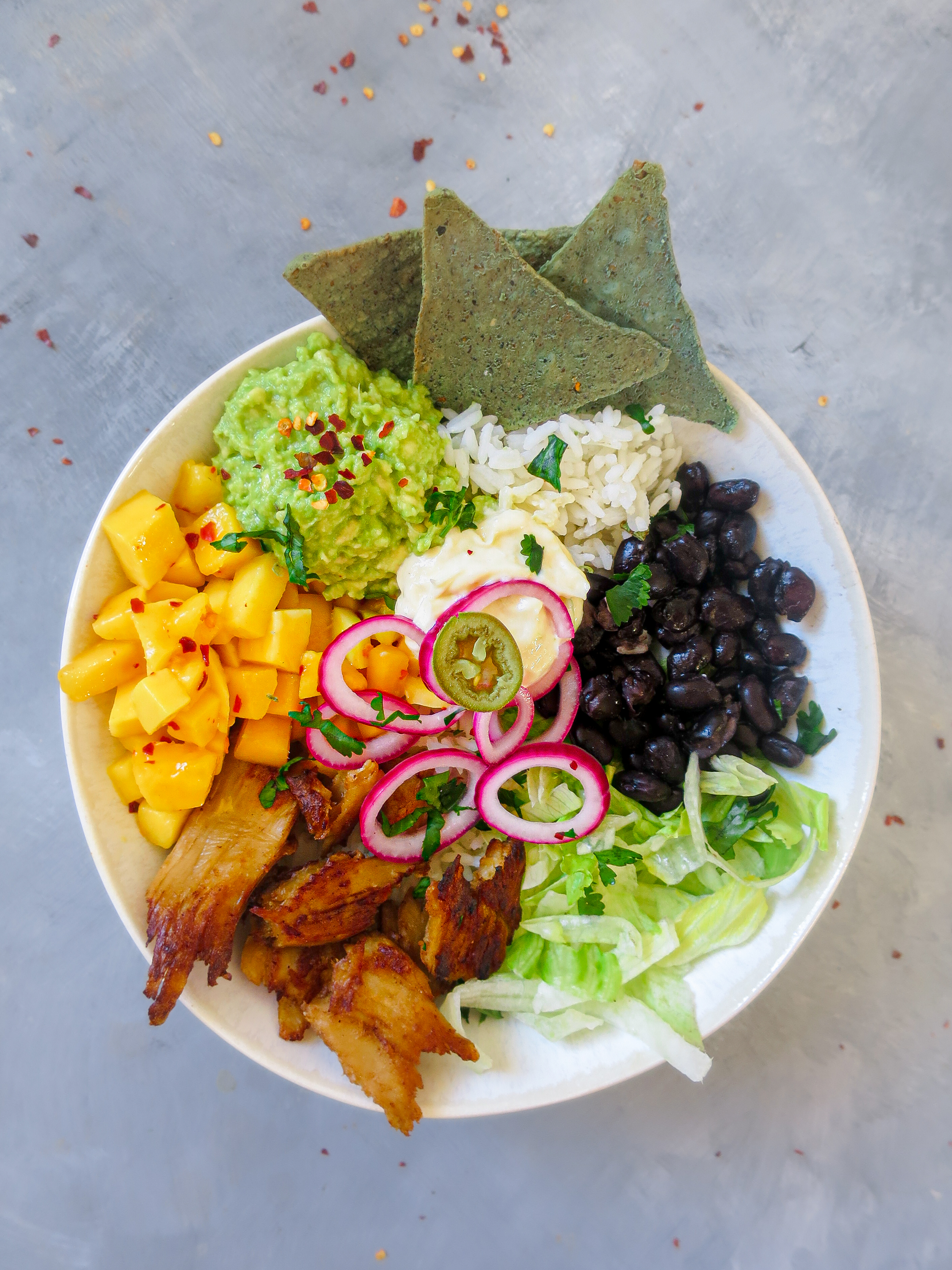 De basis van de Mexicaanse lunchbowl bestaat uit rijst, de rest vullen we op met een restje kip (of vegetarische kipstuckjes, zoals wij hier deden), zwarte bonen, een snelle guacamole, mango, ingelegde rode ui en limoen-aïoli. Klinkt als veel werk? Is het echt niet, we promise.