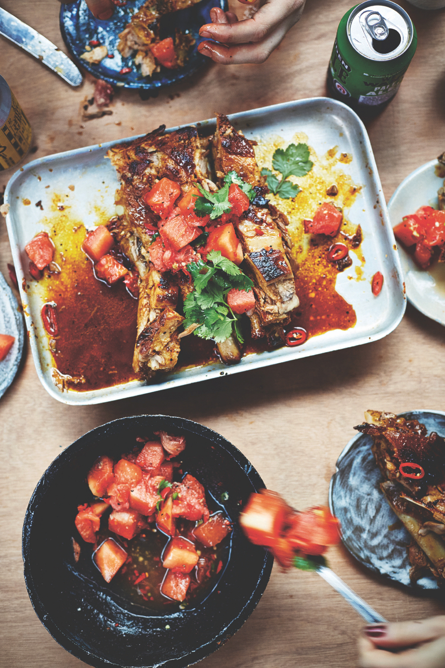 Schenk de saus over de spareribs of in een kom. Verdeel de watermeloen over het vlees. Serveer met warme tortilla’s.