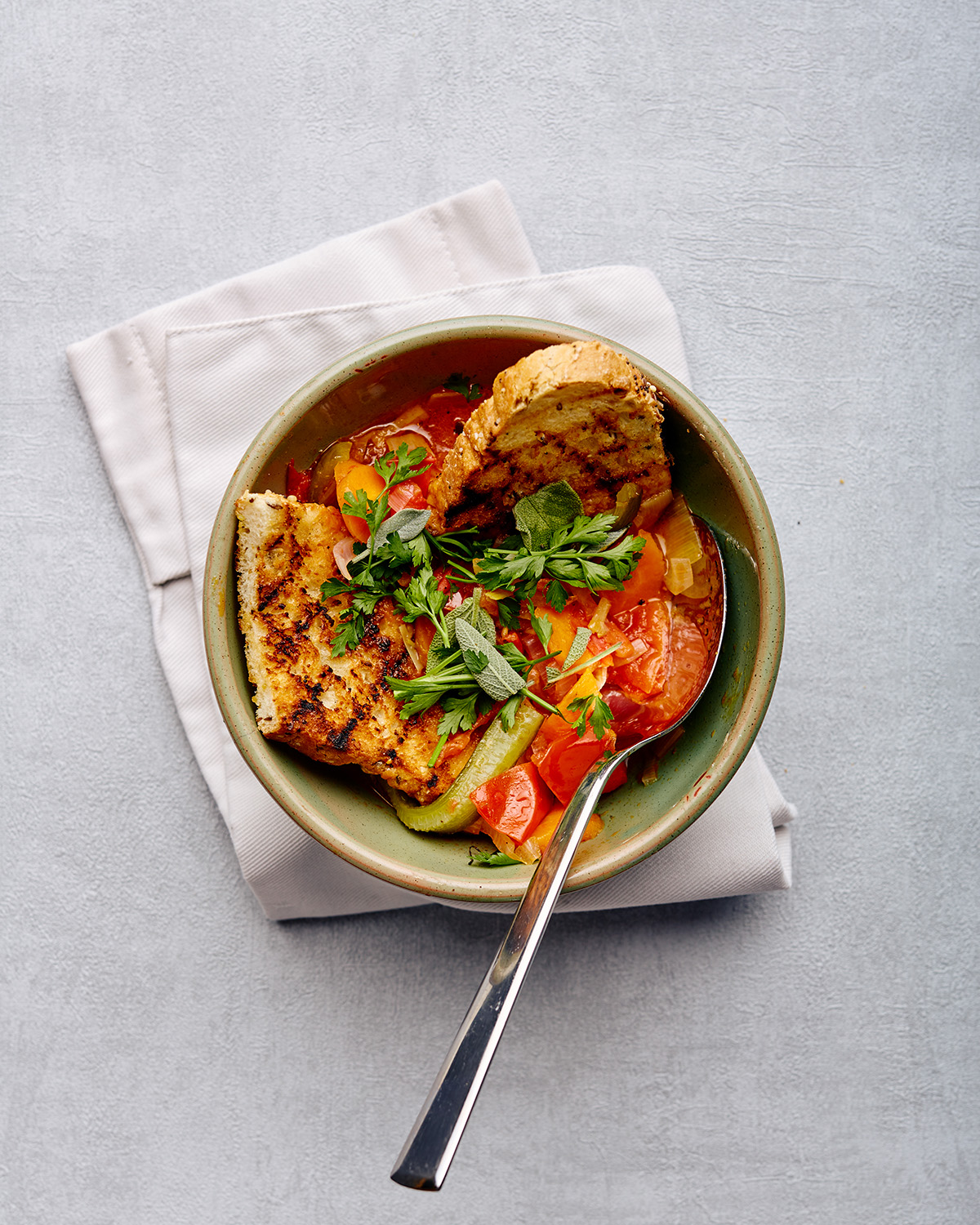 Restaurant Instock is terug met een tweede kookboek! In ‘Circular Chefs’ (geschreven door Freke van Nimwegen en Nadine Maarhuis) leer je van chefs als Joris Bijdendijk, Samuel Levie, Freek van Noortwijk en Estée Strooker hoe je klimaatvriendelijk kunt koken. Zoals met deze minestronesoep van restjes brood en tomaten.