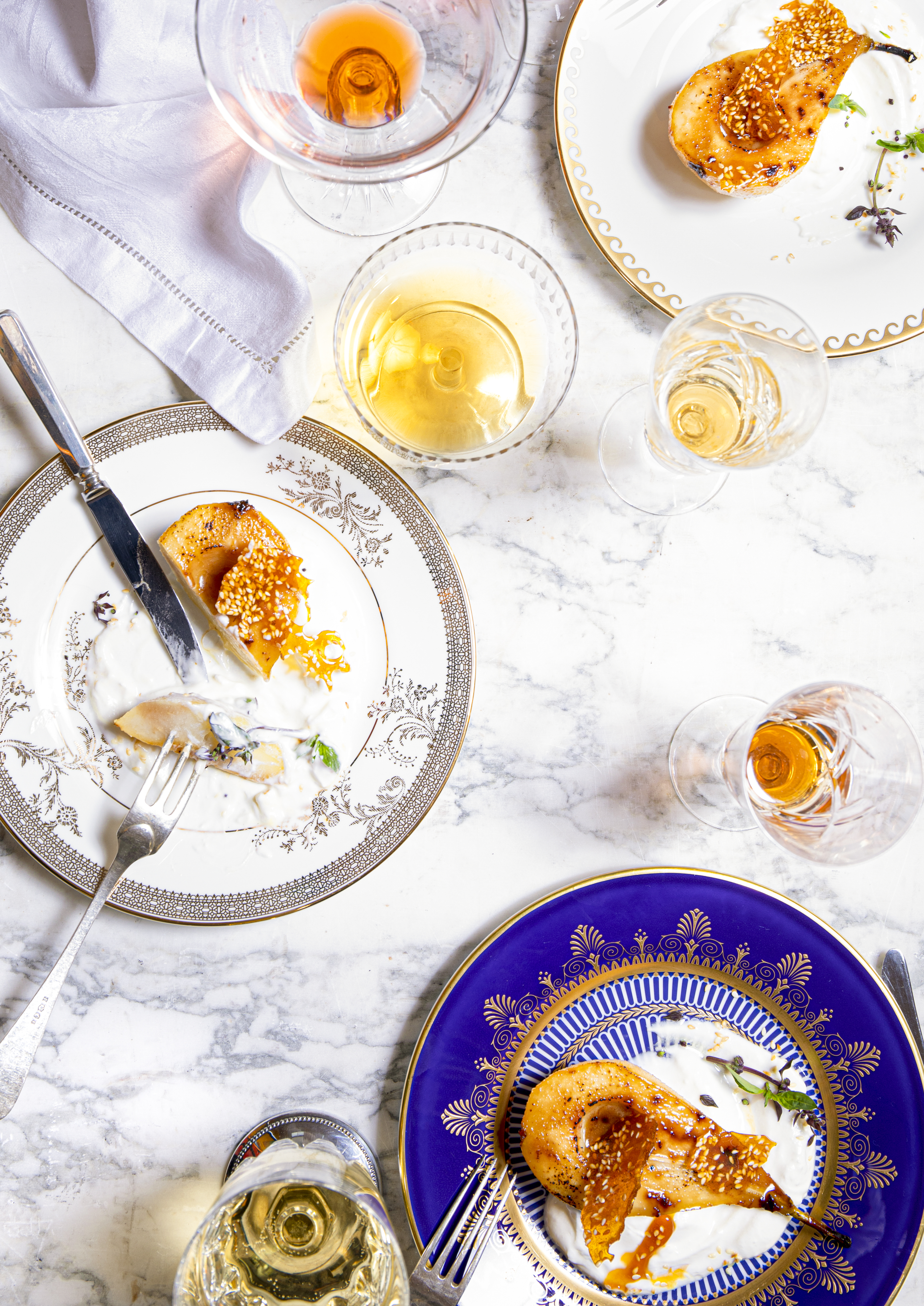 Misopeer met karrenemelk hangop en sesamkaramel