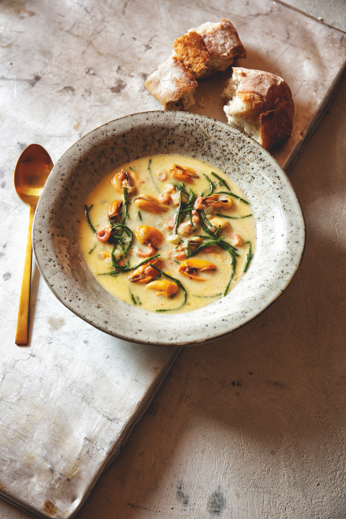 Mosselsoep met garnalen, saffraan en zeekraal van Janny van der Heijden