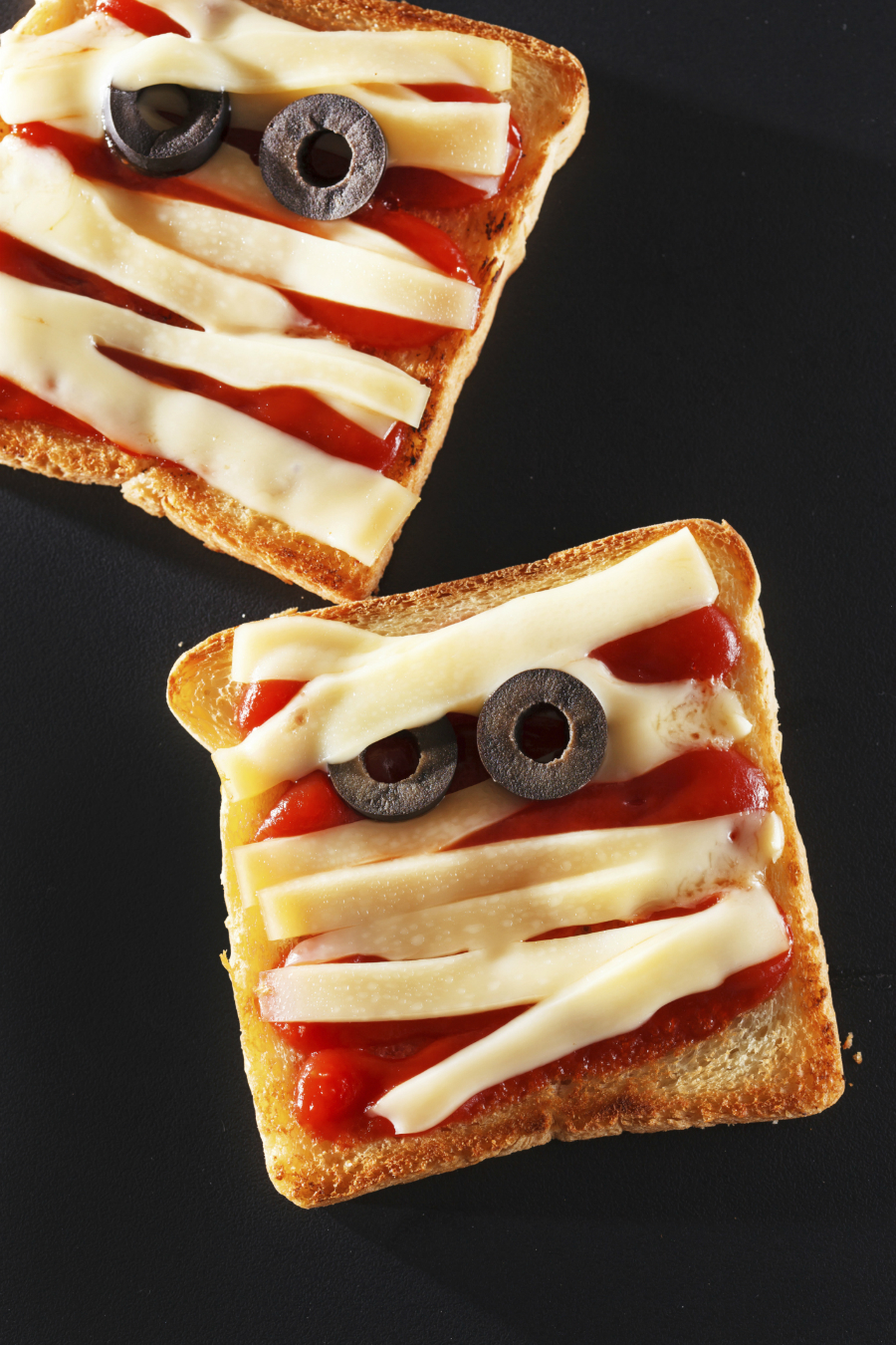 Leuk voor Halloween! Deze pizzatoastjes maak je in een mum(mie) van tijd en staan superleuk tijdens de engste avond van het jaar.