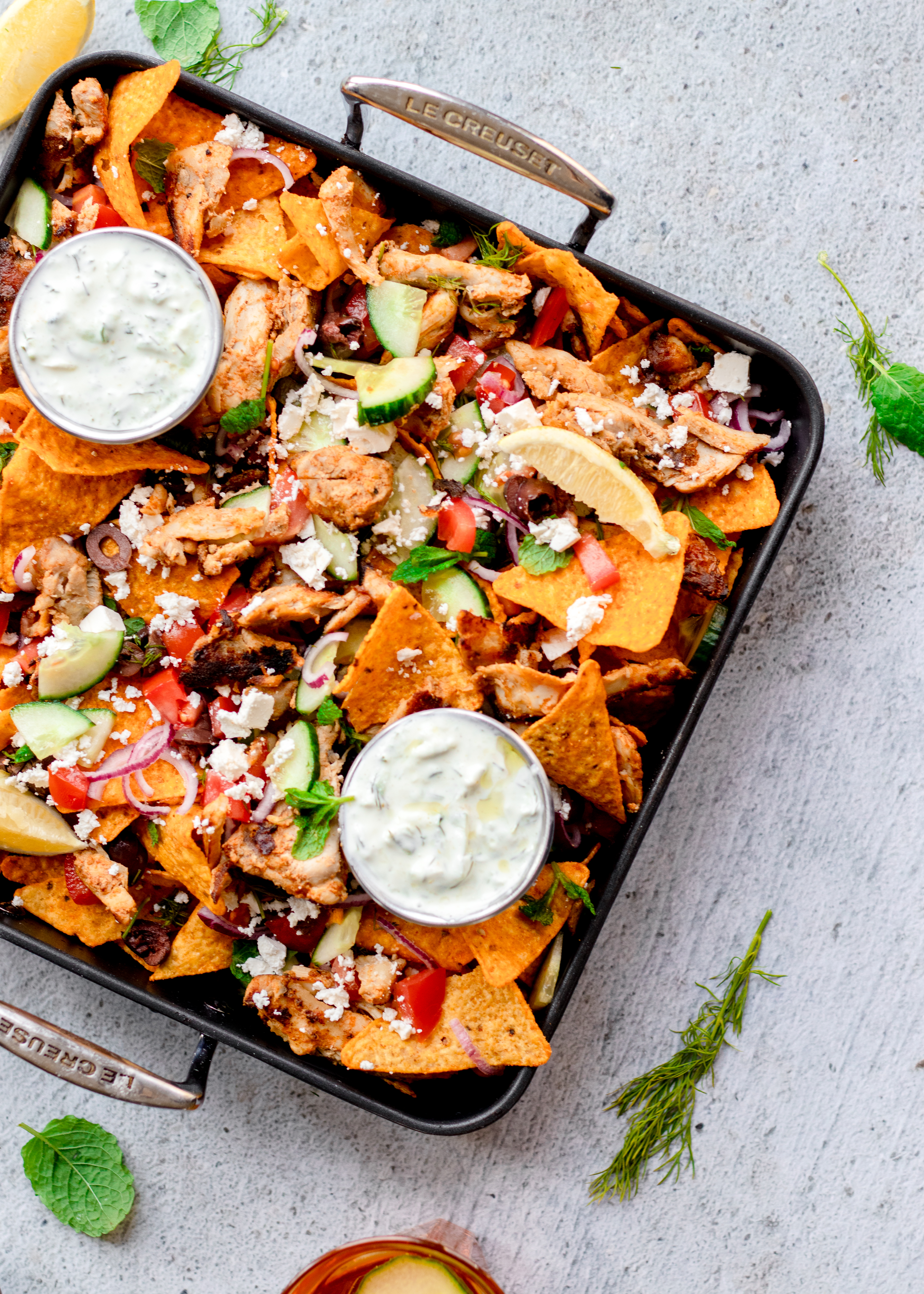 Grieks geïnspireerde nachoschotel met gyros en tzatziki