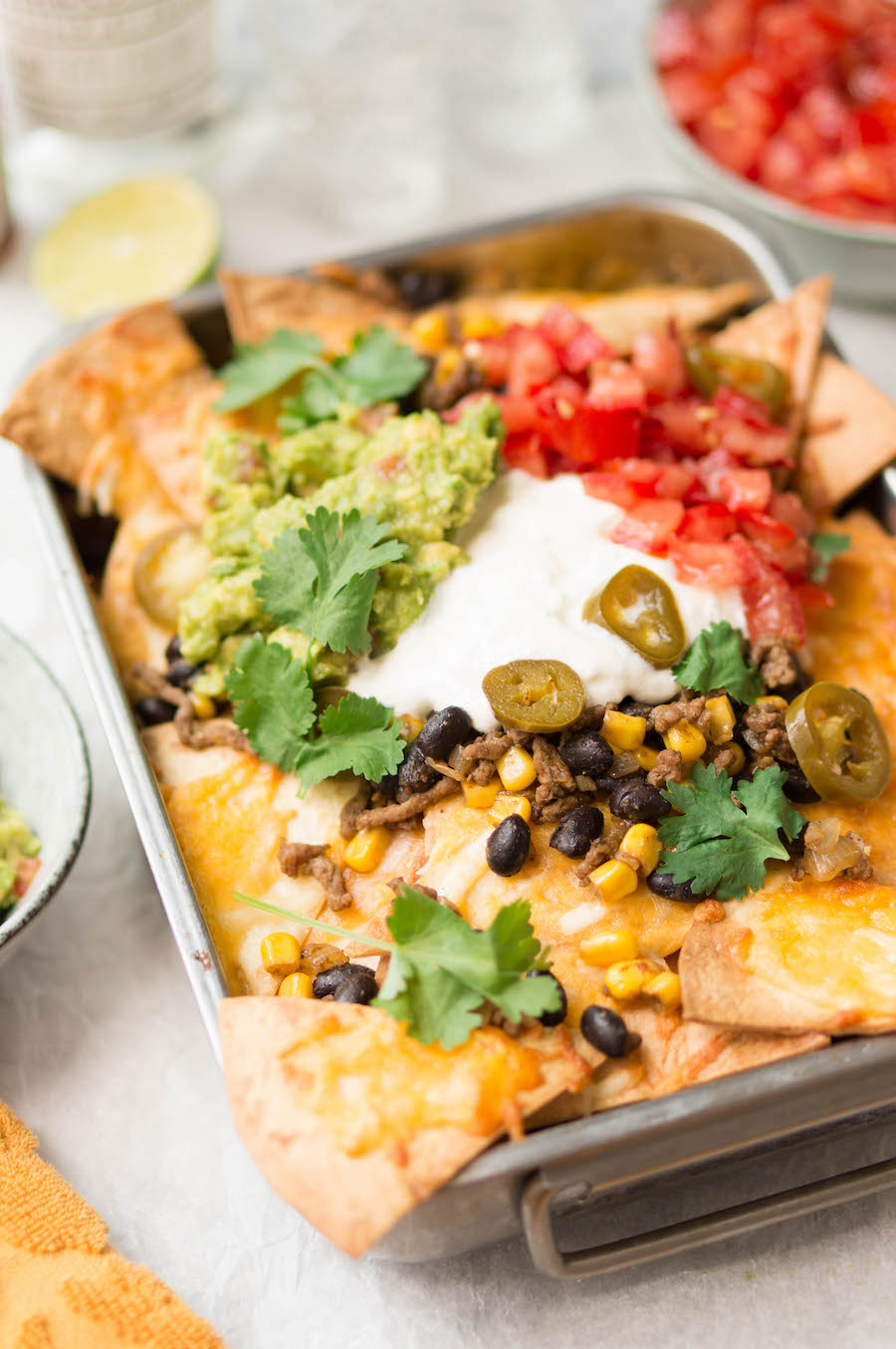 Wij maakten deze nacho’s met gehakt en kaas én met zelfgemaakte nachochips. Hoeft niet, mag wel.