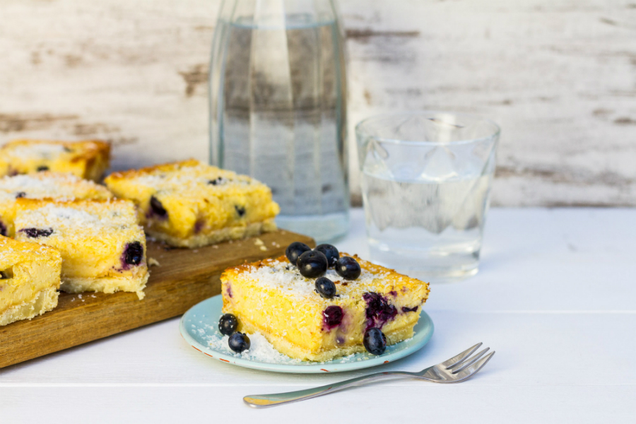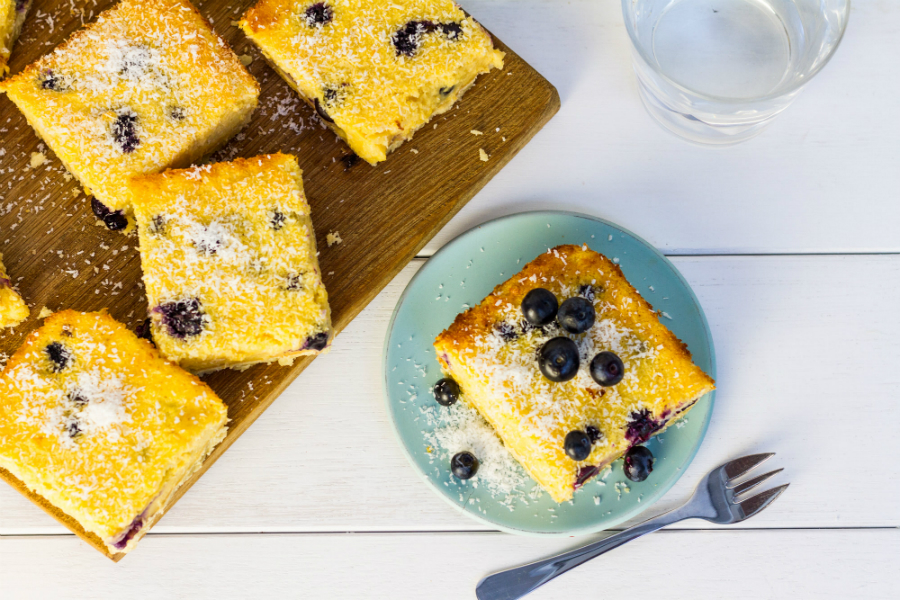Schenk het beslag op de koekbodem, verdeel de blauwe bessen over het beslag en strooi eventueel wat geraspte kokos over de bovenkant. Plaats de ovenschaal 22 tot 25 minuten in het midden van de voorverwarmde oven.