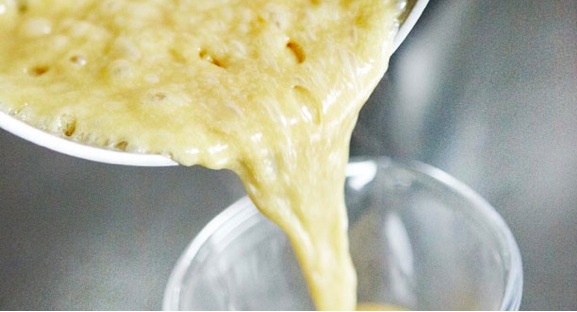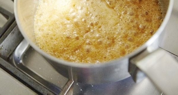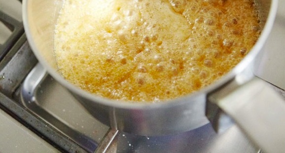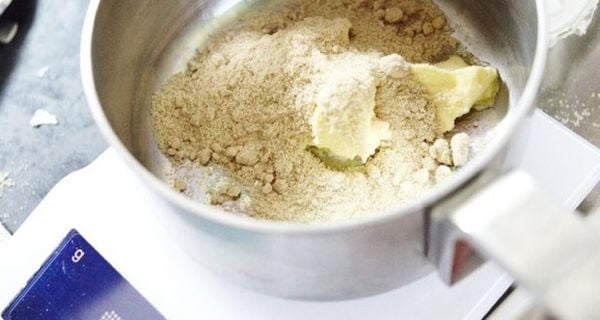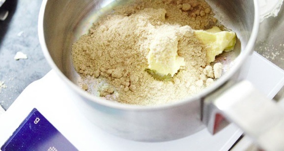 Smelt de boter, de twee soorten suiker en de golden syrup in een kleine pan met dikke boden. Laat 3 minutenĀ sudderen en draai de pan af en toe rond; niet roeren met een lepel of garde!