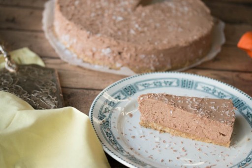 Smelt de chocolade au bain-marie. Sla de slagroom met de kristalsuiker stijf. Roer de roomkaas los. Schep de slagroom en gesmolten chocolade door de roomkaas. Giet dit mengsel bovenop de koekbodem en strijk glad met een (palet)mes of spatel.