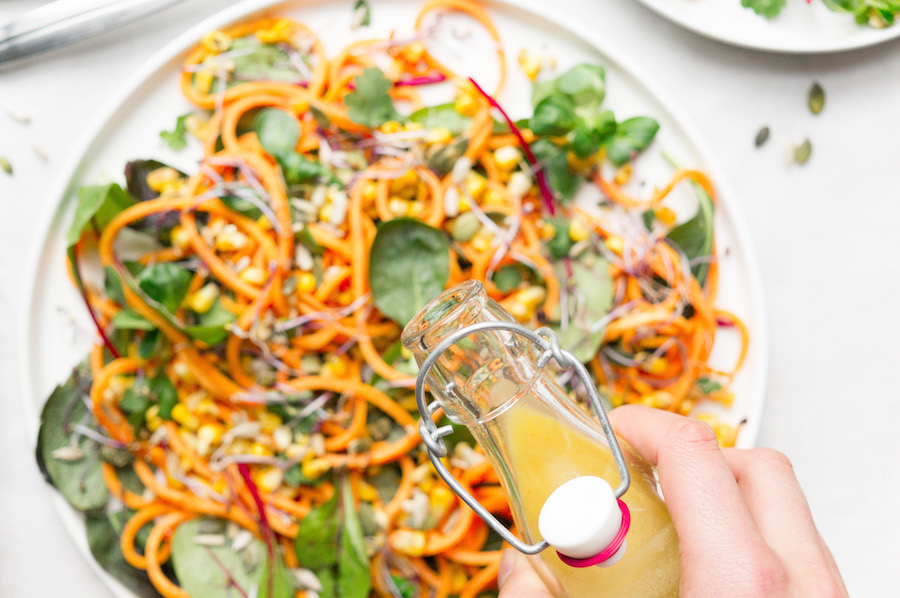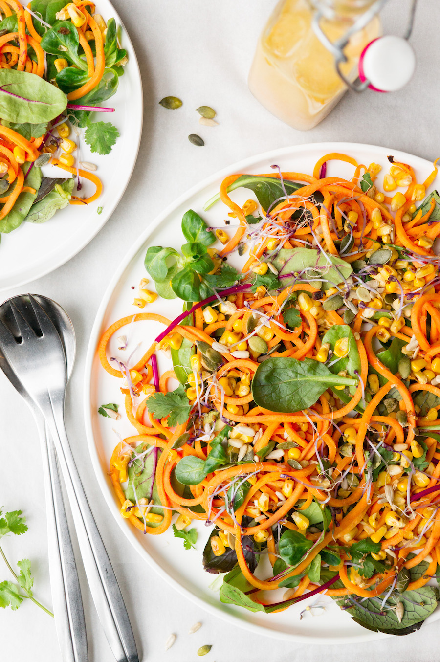 Als je eenmaal een spiralizer hebt aangeschaft, wil je daar natuurlijk zo veel mogelijk mee spelen. Met deze noedelsalade van zoete aardappel kun je je gelukkig helemaal uitleven.