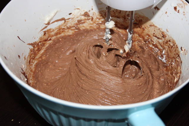 Voeg 6 grote eetlepels Nutella aan de monchou toe en begin het een beetje door elkaar te roeren met een lepel of vork. Voeg de poedersuiker en de volle melk eraan toe en begin langzaam met mixen. Tijdens het mixen een scheutje vanille extract erbij gieten. Meng door tot een stevig beslag zonder klontjes.