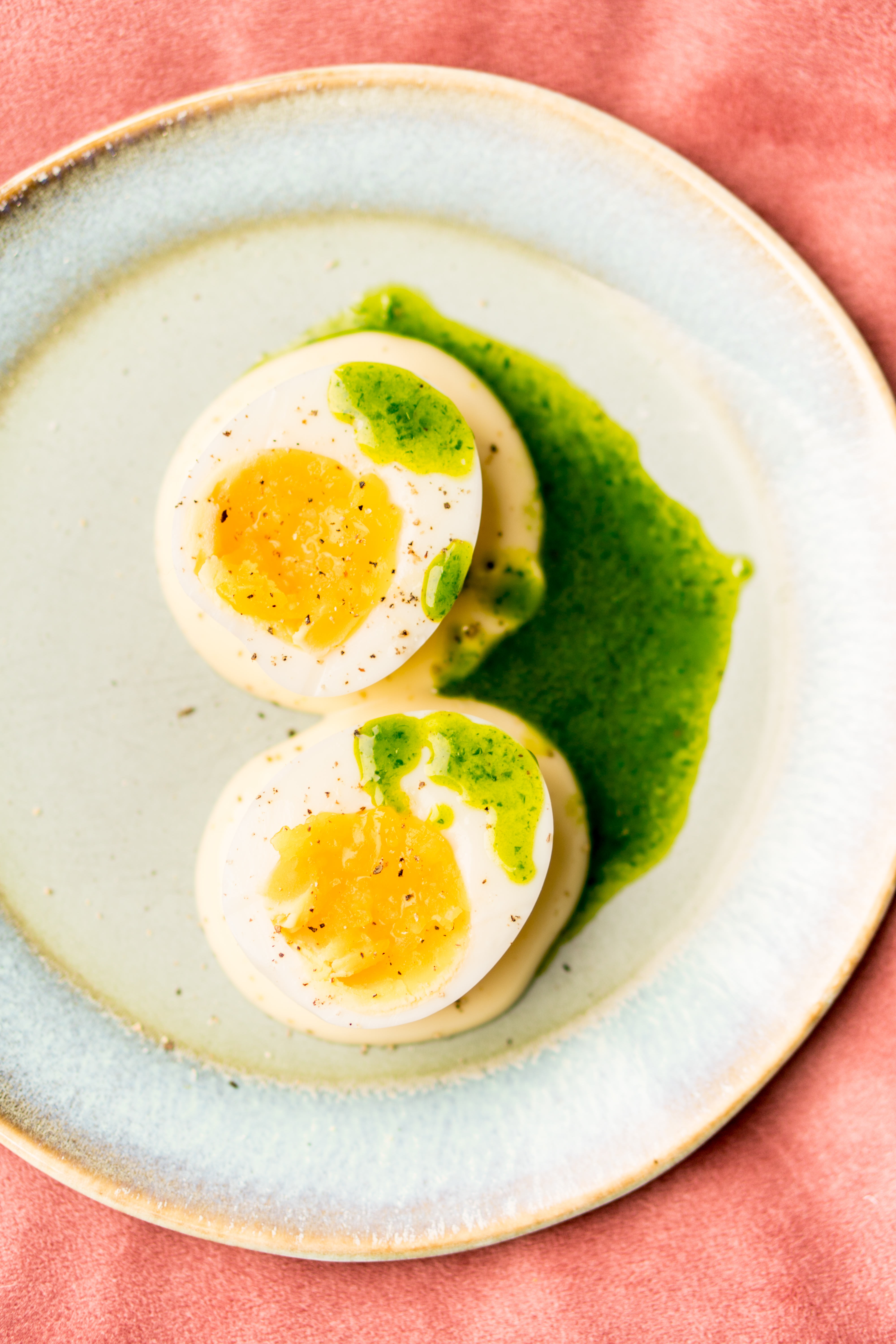 - Pel de eieren voorzichtig en snijd ze doormidden. Leg op een bordje twee glanzende hoopjes van de mayonaise. Leg de helften van het ei hierop. Breng op smaak met zout en peper en druppel er tot slot wat van de peterselie-olie overheen. Et voilĆ : oeufs mayonnaise!