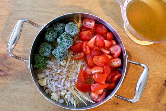 Wij braken de spaghetti één keer in het midden zodat het allemaal wat beter past. Giet hierbij 550 ml bouillon of water, houd een beetje extra achter voor als dat later nodig blijkt.